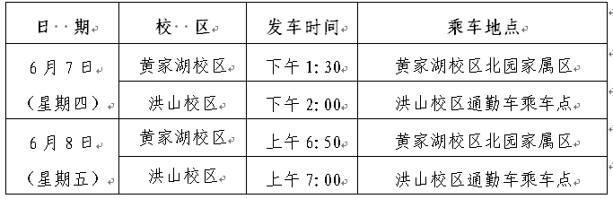 注:1、黄家湖校区从北园家属区乘车点出发经停教四楼乘车点;