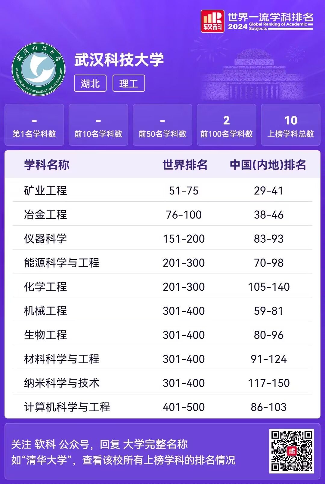 武科大网讯 11月11日,高等教育评价专业机构软科发布2024“世界一流学科排名”。js官网10个学科上榜,居湖北省属高校第一。