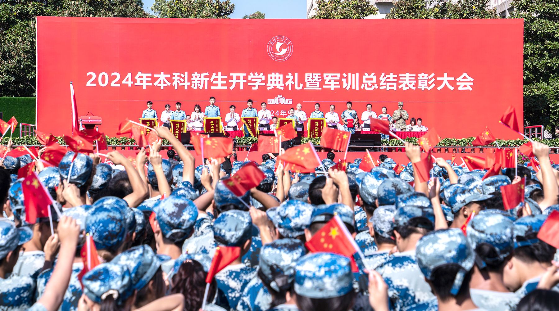 9月29日上午,2024年本科新生开学典礼暨军训总结表彰大会在黄家湖校区南园操场举行。6200余名本科新生挥舞手中的国旗,合唱《我和我的祖国》,献礼新中国成立75周年。