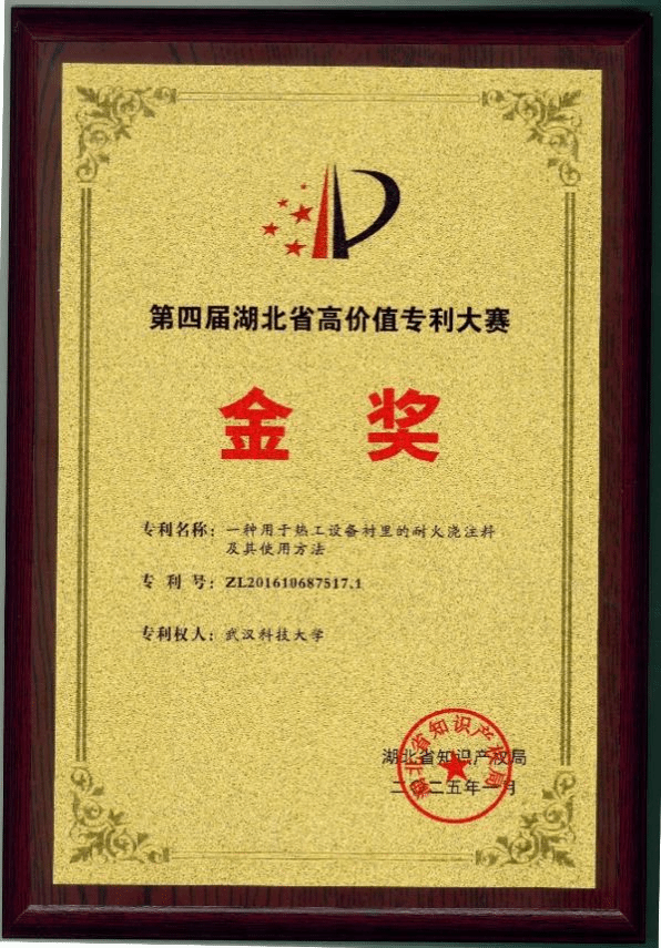 武科大网讯(通讯员张美杰) 1月21日,2025年全省知识产权局局长会议暨知识产权强省建设推进会召开,材料学部绿色功能耐火材料研究团队张美杰、黄奥、顾华志、罗志安、杨梦发明的专利《一种用于热工设备衬里的耐火浇注料及其使用方法》(专利号ZL201610687517.1)荣获第四届湖北省高价值专利大赛金奖,省属高校唯一。