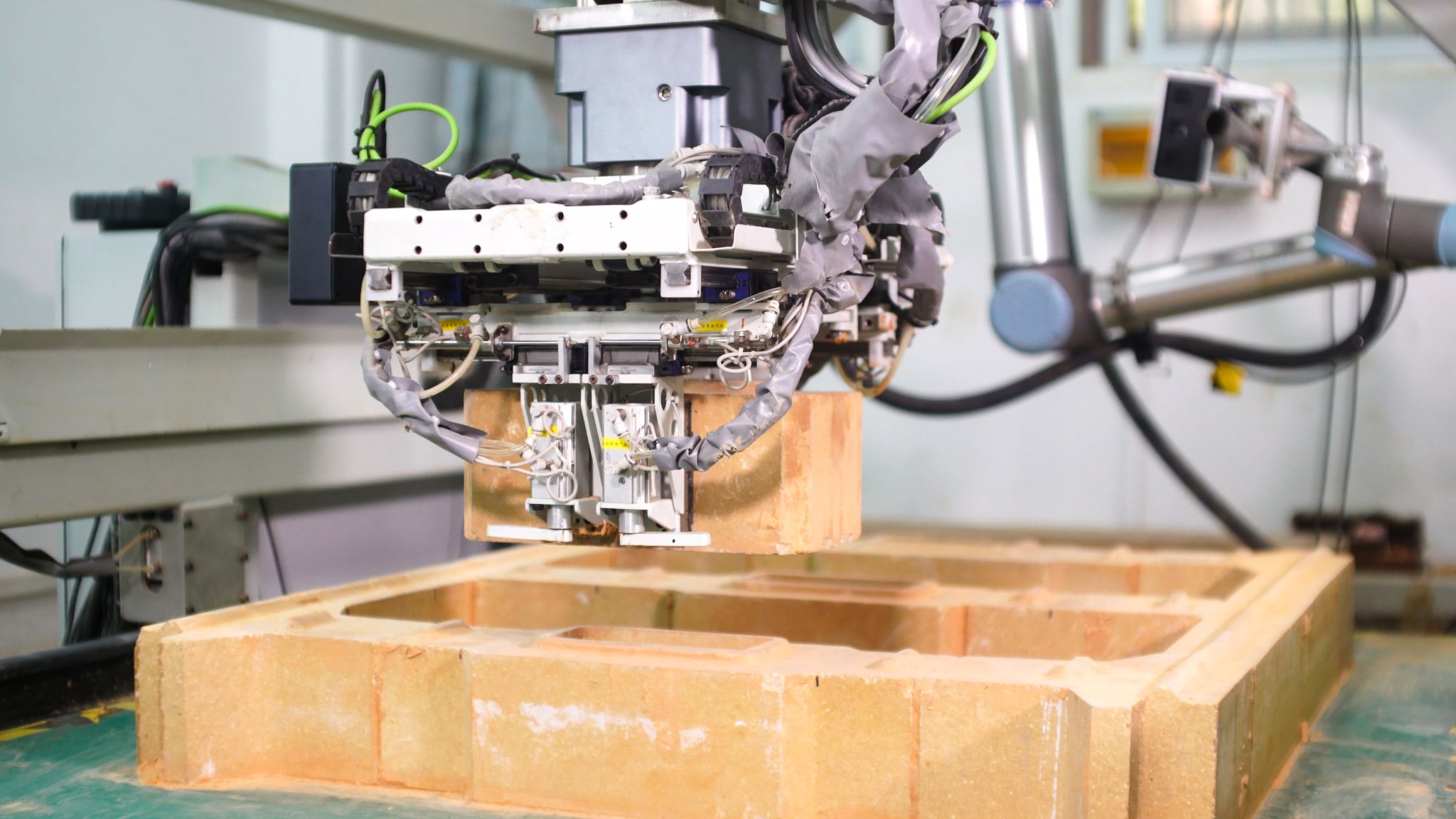 在现场观摩点,工作人员手持三维扫描装置,短短数秒就能将一块耐火砖转化为数字模型,并在虚拟空间中完成砌筑仿真与机械臂运动控制;轻触屏幕启动“一键砌筑”,机器臂便可自动完成从抓取、涂浆到砌筑的全流程操作。