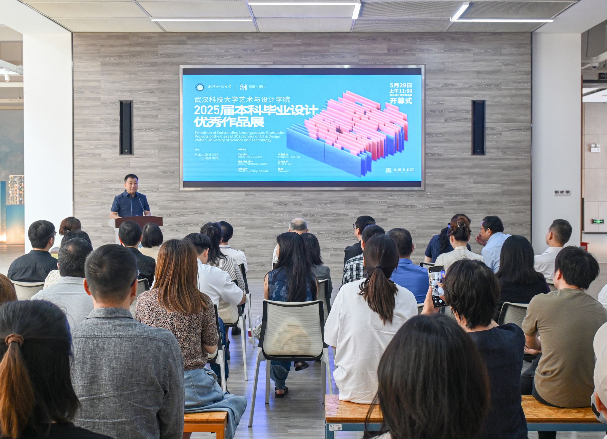 武科大网讯(通讯员彭文博 记者李周阳 摄影刘铮 李周阳)5月29日上午,艺术与设计学院2025届本科毕业设计优秀作品展在黄家湖校区沁湖美术馆开幕。校长倪红卫出席开幕式并致辞。