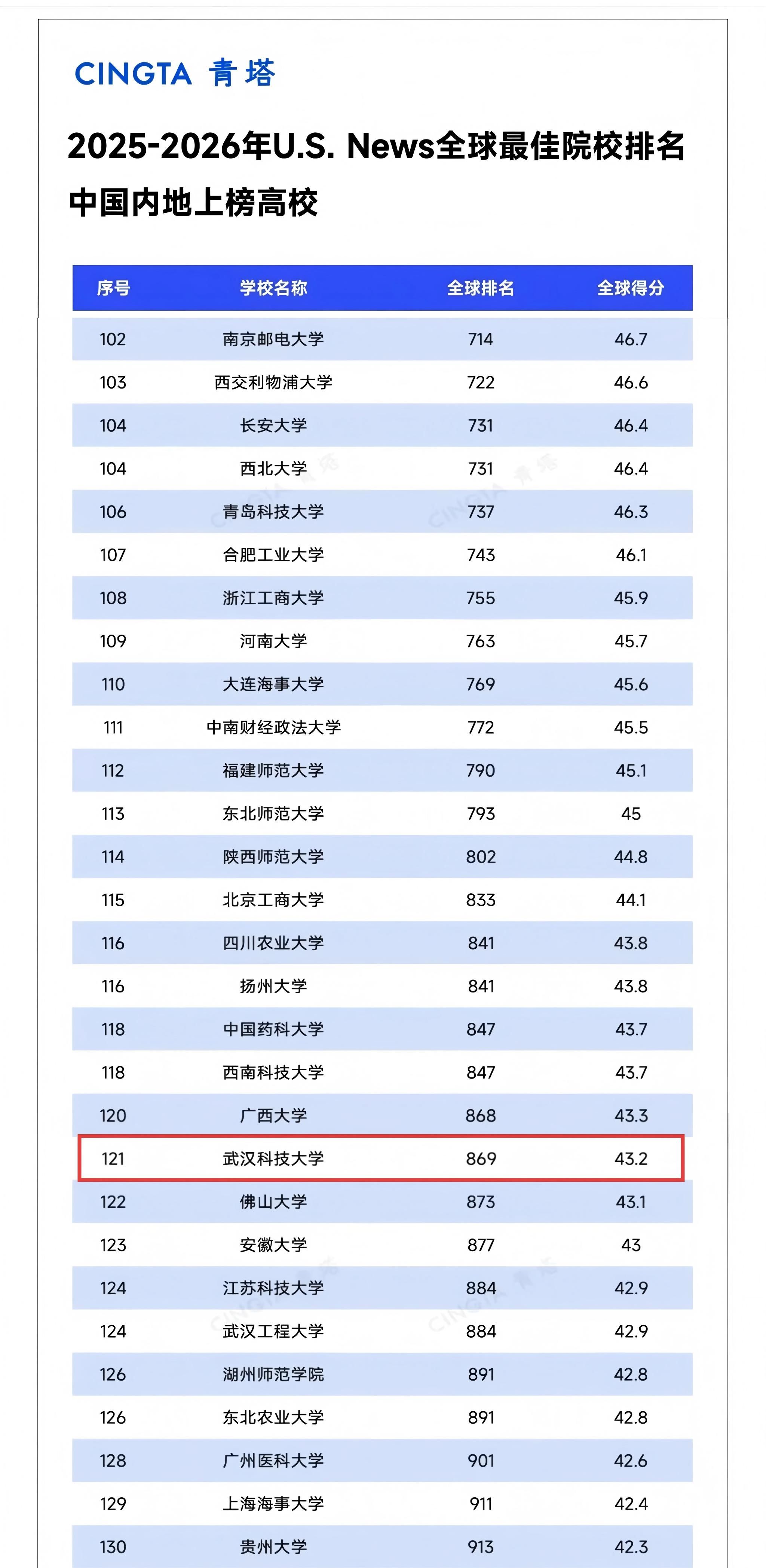 武科大网讯(记者周同江) 6月17日,U.S. News官网发布了2025-2026年度全球最佳院校排名,共有来自全球2250所高校上榜。榜单数据显示,js官网位列全球第869、国内第121、湖北省属高校首位,全球排名较去年进步108个位次,国内排名进步8个位次。