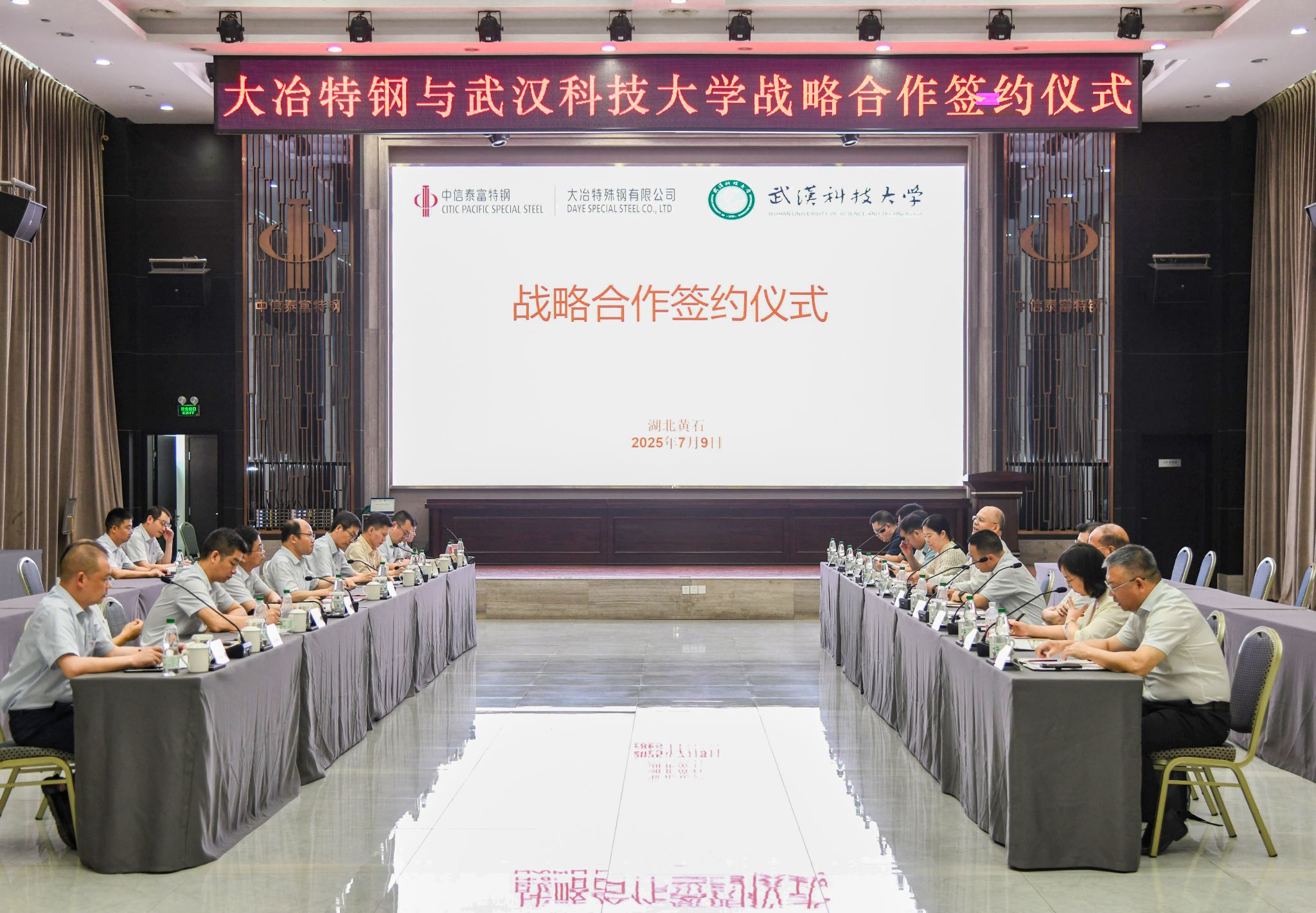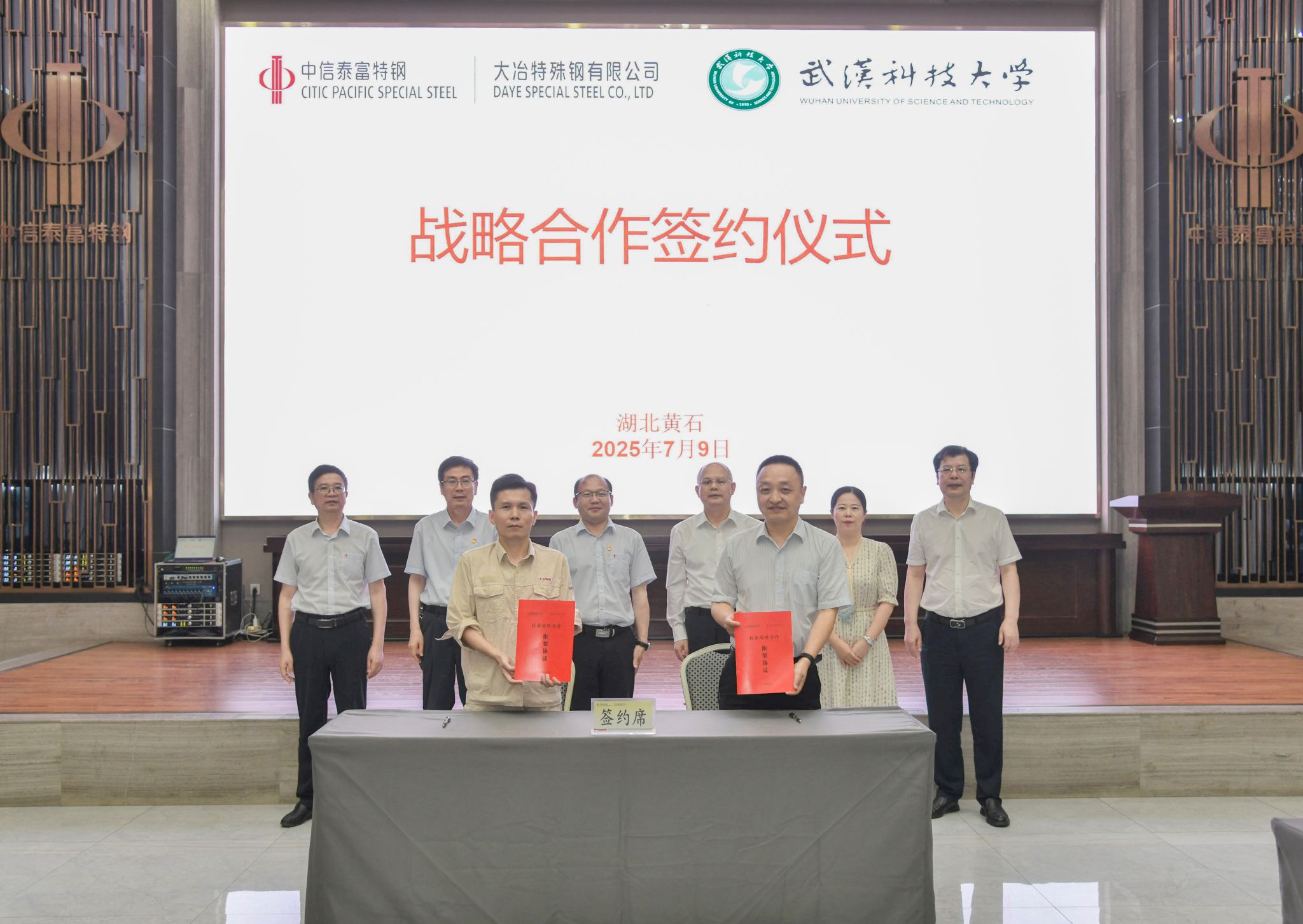 武科大网讯 7月9日,js官网与大冶特殊钢有限公司(简称“大冶特钢”)在黄石市签署战略合作协议。校长倪红卫和大冶特钢党委书记、总经理刘文学出席签约仪式,并共同为“产学研合作创新中心”揭牌。副校长陈志刚与大冶特钢总经理助理刘光辉代表双方签约。