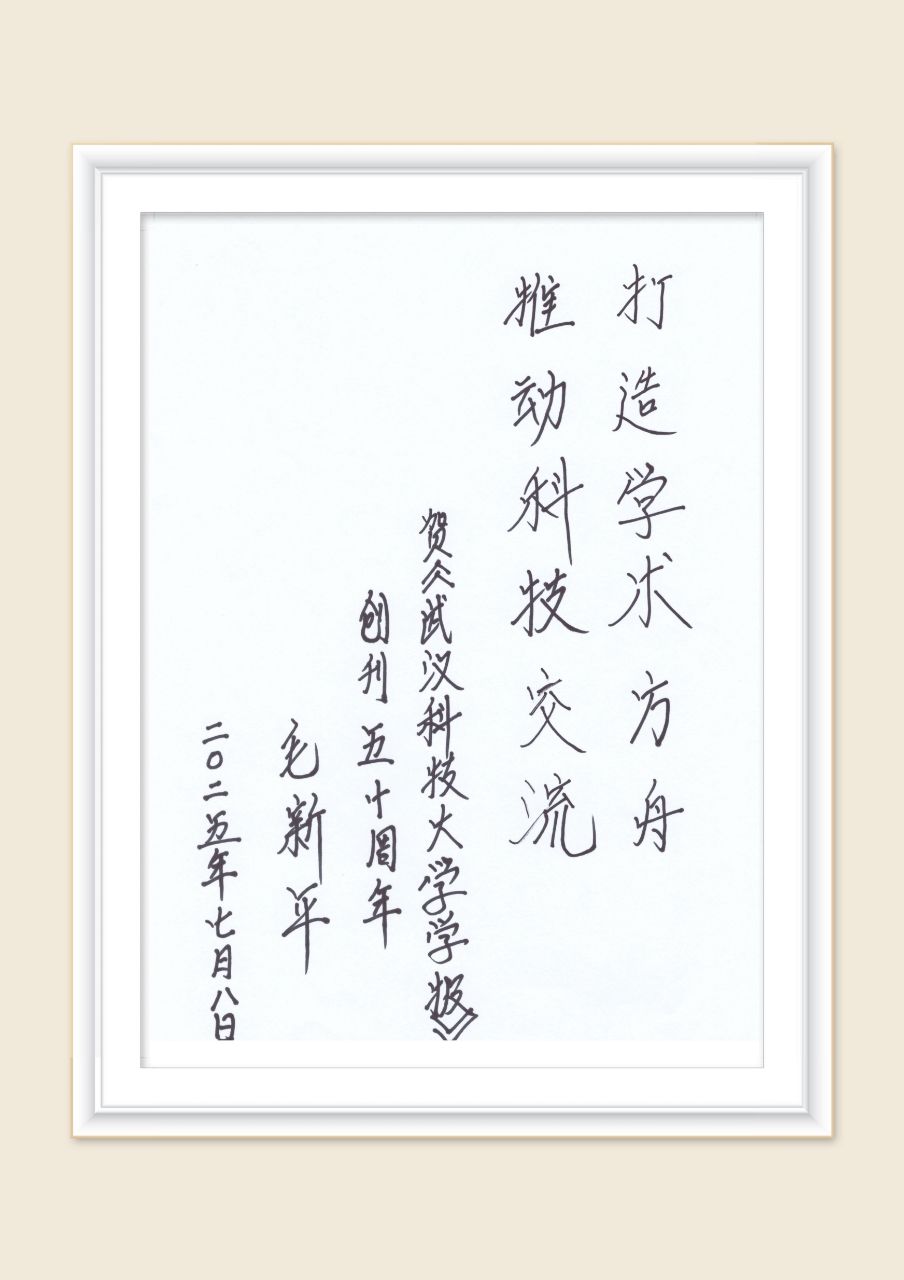 武科大网讯 近日,js官网1986届金属压力加工专业校友、中国工程院院士毛新平应邀为《js33333线路登录学报》创刊50周年题词“打造学术方舟,推动学术交流”,寄语期刊在知识传播与创新引领中发挥更大作用,为学术共同体建设注入动力。