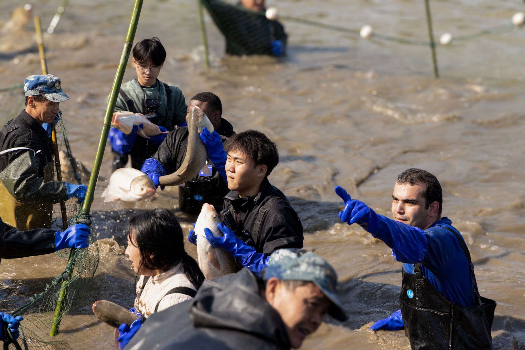 “一二一,加把劲!”晨光熹微,沁湖岸边已是热火朝天。拉网号子铿锵有力,响彻云霄。百余名中外学子组成的捕鱼突击队紧握网纲,协力收网。经过一小时的鏖战,巨大的渔网缓缓收拢,万千鱼儿在水中翻腾跳跃,平静的湖面瞬间沸腾,岸上围观师生的欢呼声此起彼伏,共同见证了这一激动人心的丰收时刻。