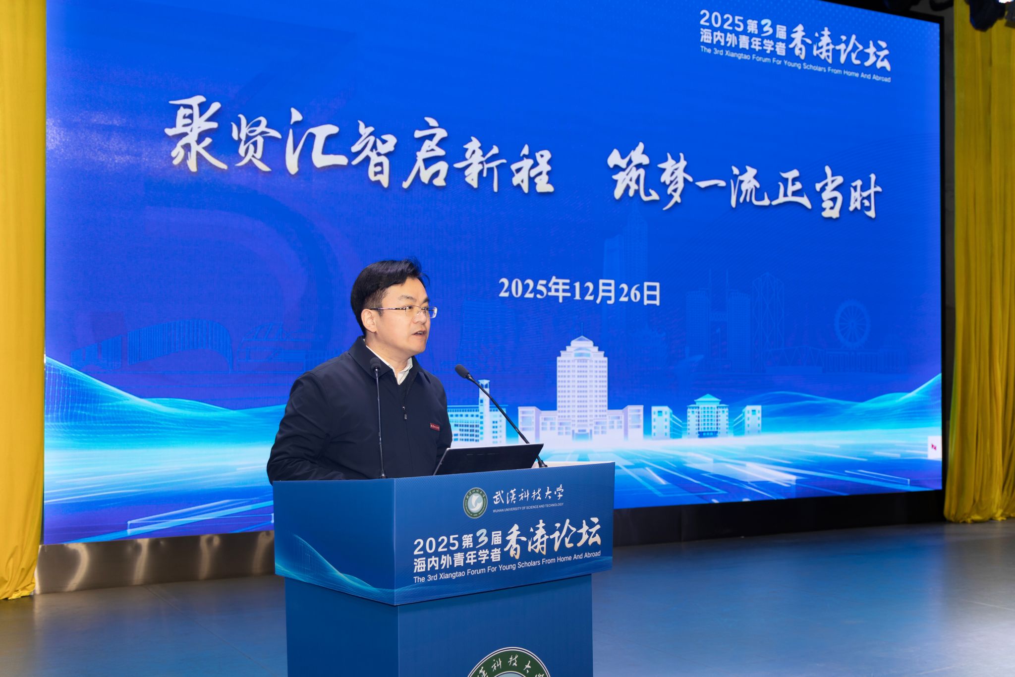 倪红卫代表学校致辞。他从“生机蓬勃的沃土”“底蕴深厚的家园”“特色鲜明的学科”“日新月异的发展”四个维度介绍学校情况。他表示,武科大正处于快速发展、爬坡过坎的关键阶段,比以往任何时候都更渴求人才。学校愿当好人才的“后勤部长”和事业发展的“合伙人”,通过实施香涛学者计划、推行职称评审“绿色通道”等举措,建立特殊支持机制,全面助力青年人才成长。他诚挚邀请海内外青年才俊加盟武科大,将个人追求融入国家发展大潮,共谱百年学府新篇章。