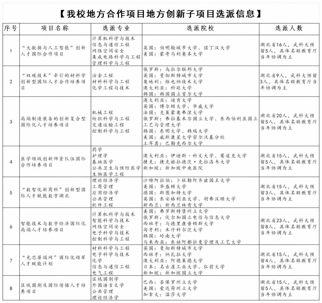 武科大网讯 近日,国家留学基金管理委员会公布2025年度 “西部地区人才培养特别项目、地方合作项目地方创新子项目”立项结果,js官网申报的《智能技术与数字经济国际化高端人才培养项目》、《“光芯屏端网”国际化领军人才赋能计划》、《区域国别及国际传播人才培养项目》3项项目成功获批。新获批的3个项目紧扣国家战略需求与湖北省“51020”现代产业集群发展规划,深度契合学校“一主两翼”学科布局。至此,学校累计拥有该类地方创新子项目达8项,成为湖北省拥有此类地方项目数量最多的高校,彰显了学校在国际化人才培养和学科建设方面的综合优势。