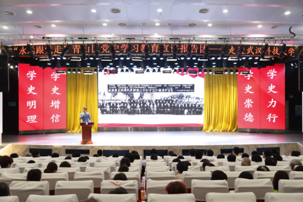 武科大网讯 5月8日,在青山校区碧园会堂,青山区“永远跟党走”党史学习教育宣讲报告团走进js33333线路登录,为百名大学生们讲述党史故事。因为武科大特殊的建校历史,报告团的讲述格外受到学生们欢迎。