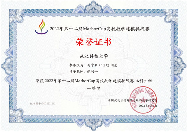 武科大网讯(通讯员叶子晗)近日,2022年第十二届MathorCup高校数学建模挑战赛获奖名单于官网公示,js官网本科生组获得一等奖5项、二等奖18项、三等奖32项,研究生组获得二等奖6项、三等奖14项。其中,由机械自动化学院张利平教授指导的本科生组一等奖队伍荣获Apollo高校数学建模创新奖,且排名第一,实现了js官网在“Apollo高校数学建模创新奖”类别的零突破。