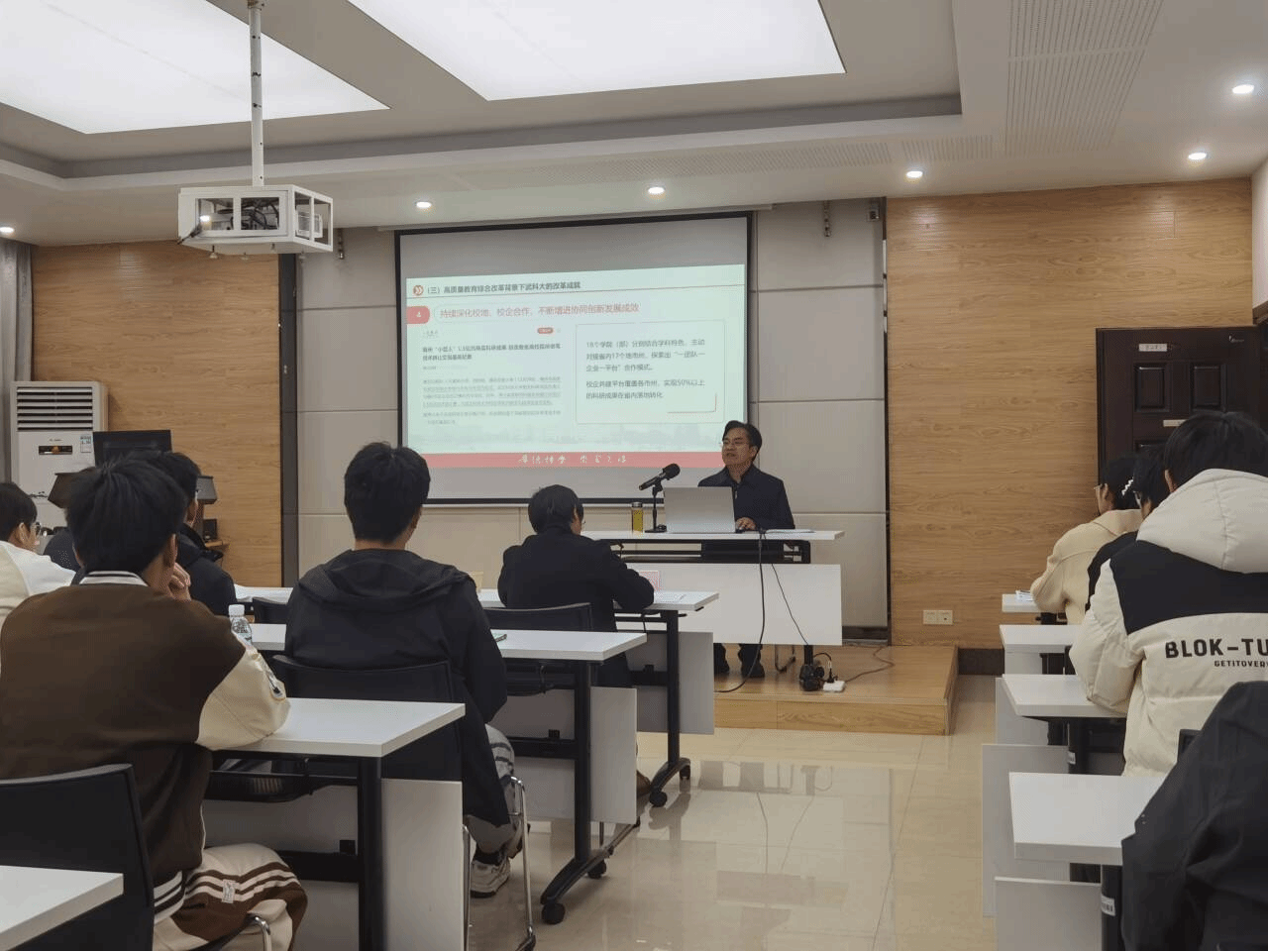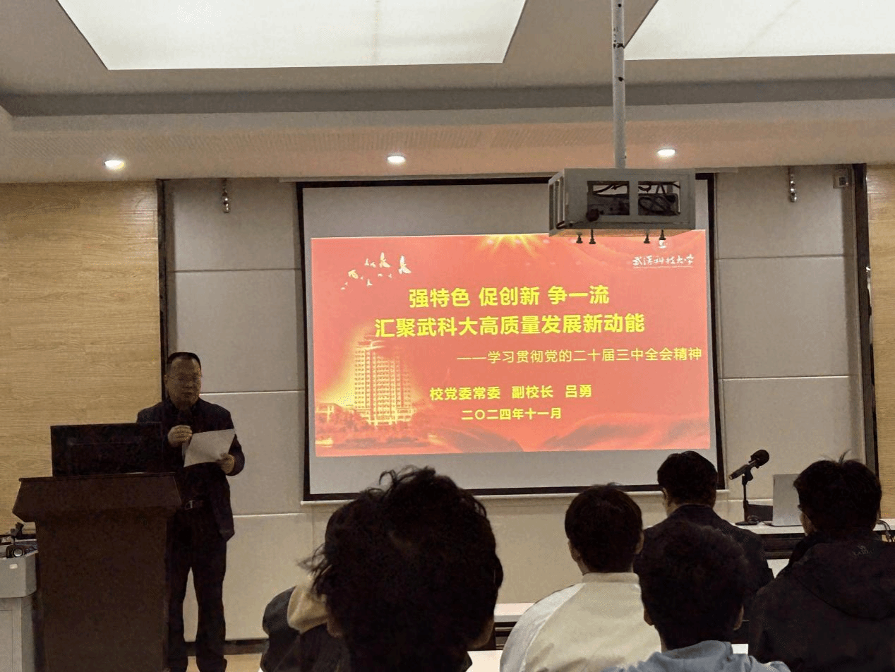 武科大网讯(通讯员张槐玲 汪川)为全面深入学习党的二十届三中全会精神,增强师生对党的创新理论的理解与认同,11月25日下午在黄家湖校区90520学术报告厅,校党委常委、副校长吕勇以“强特色 促创新 争一流 汇聚武科大高质量发展新动能”为题,为汽车与交通工程学院师生讲授了一堂生动的专题思政课。汽车与交通工程学院领导班子成员、专任教师、辅导员、研究生和本科生代表60余人参加。思政课由学院党委书记李建军主持。
