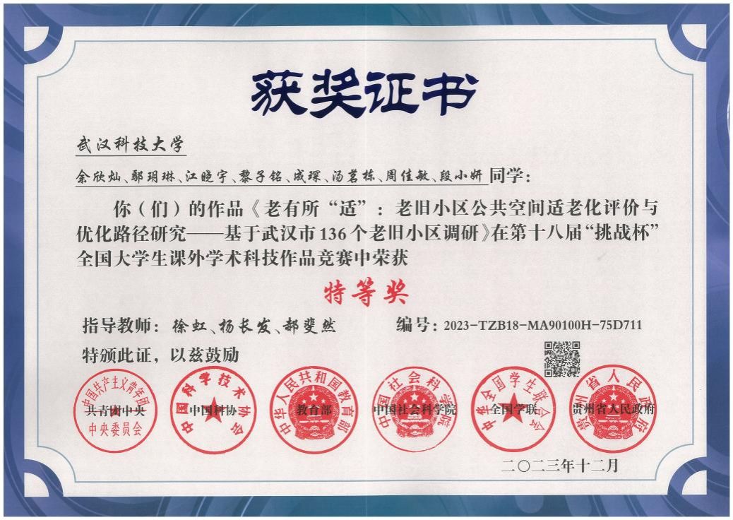 2023年,在第十八届“挑战杯”全国大学生课外学术科技作品竞赛中,由徐虹、杨长发、郝斐然三位老师指导的学生参赛作品《老有所“适”:老旧小区公共空间适老化评价与优化路径研究——基于武汉市136个老旧小区调研》获哲学社会科学类社会调查报告特等奖。这是js33333线路登录在“挑战杯”全国大学生课外学术科技作品竞赛中首次获得特等奖,也是本届湖北省唯一的一项哲学社会科学类社会调查报告全国特等奖。