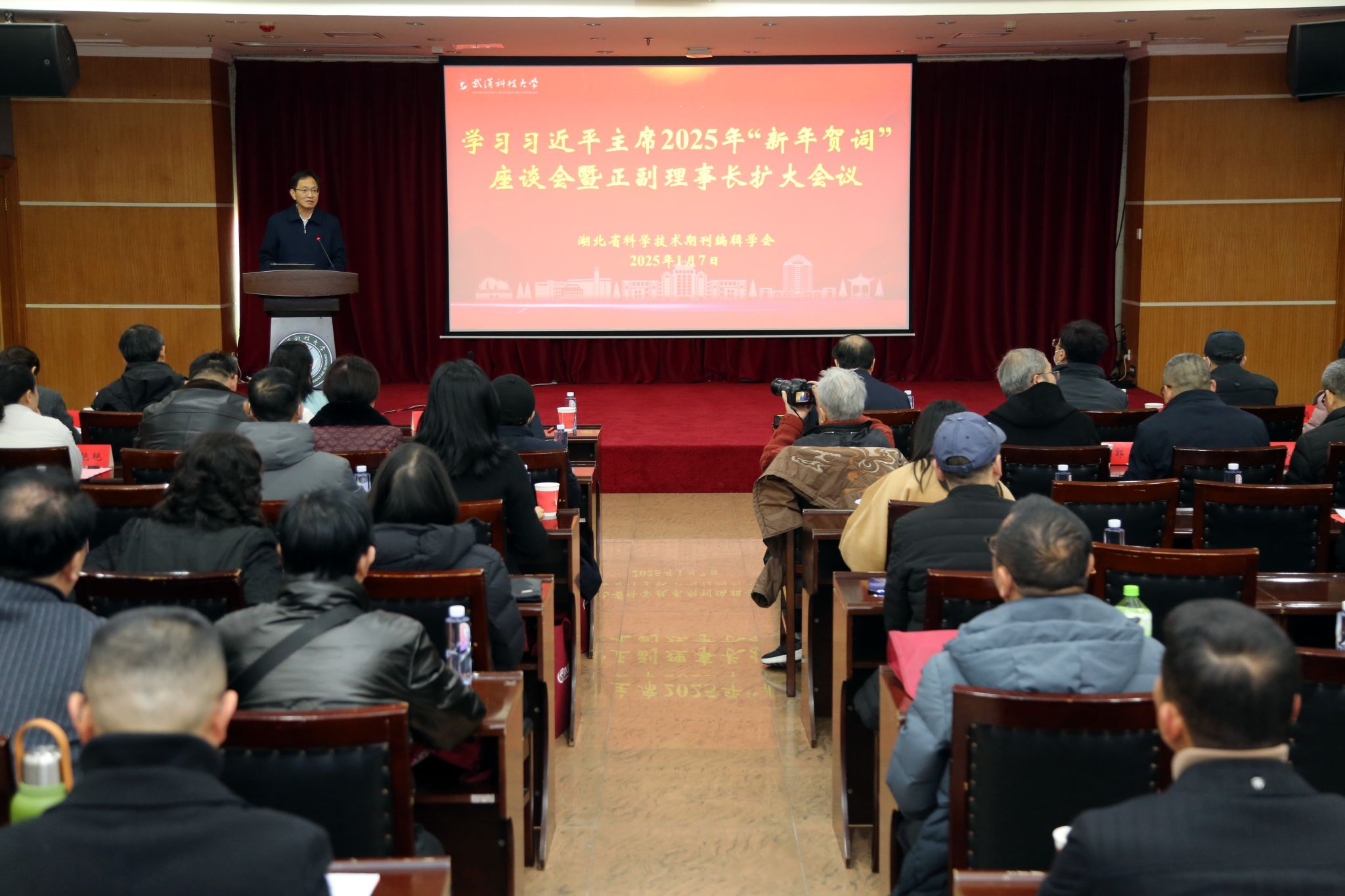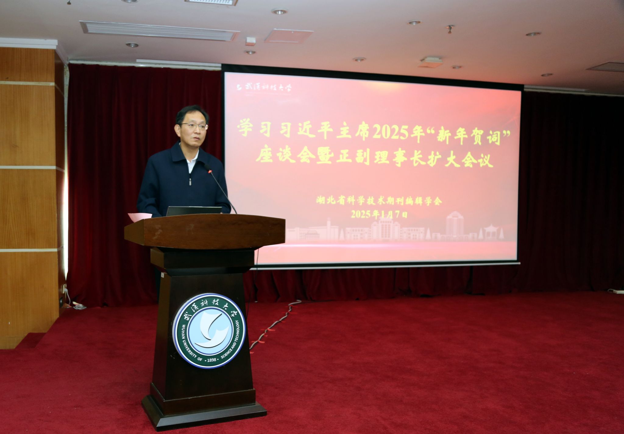 武科大网讯 1月7日,学习习近平主席 2025 年 “新年贺词” 座谈会暨湖北省科技期刊编辑学会正副理事长扩大会议于js官网青山校区主楼18楼报告厅举行。校党委副书记孙国胜出席会议并致辞。会议由湖北省科技期刊编辑学会理事长赵经主持,近百位相关领域专家学者齐聚一堂。