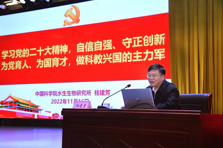桂建芳在宣讲报告中,全面梳理了党的二十大报告的主要内容,对“实施科教兴国战略,强化现代化建设人才支撑”做出了详细且深刻的解读,结合中科院水生生物研究所的科研发展、人才成长、科学精神,以及老一辈科学家和他自己的科研经历,畅谈如何做到自信自强、守正创新,为党育人、为国育才,争当科教兴国的主力军。