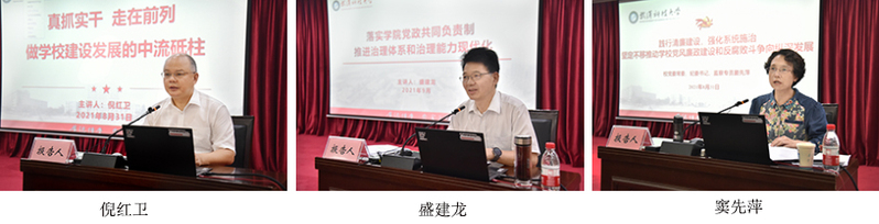 校长倪红卫以《真抓实干 走在前列 做学校建设发展的中流砥柱》、校党委副书记盛建龙以《落实学院党政共同负责制 推进治理体系和治理能力现代化》、校纪委书记窦先萍以《践行清廉建设,强化系统施治 坚定不移推动学校党风廉政建设和反腐败斗争向纵深发展》为主题分别作了重要报告。