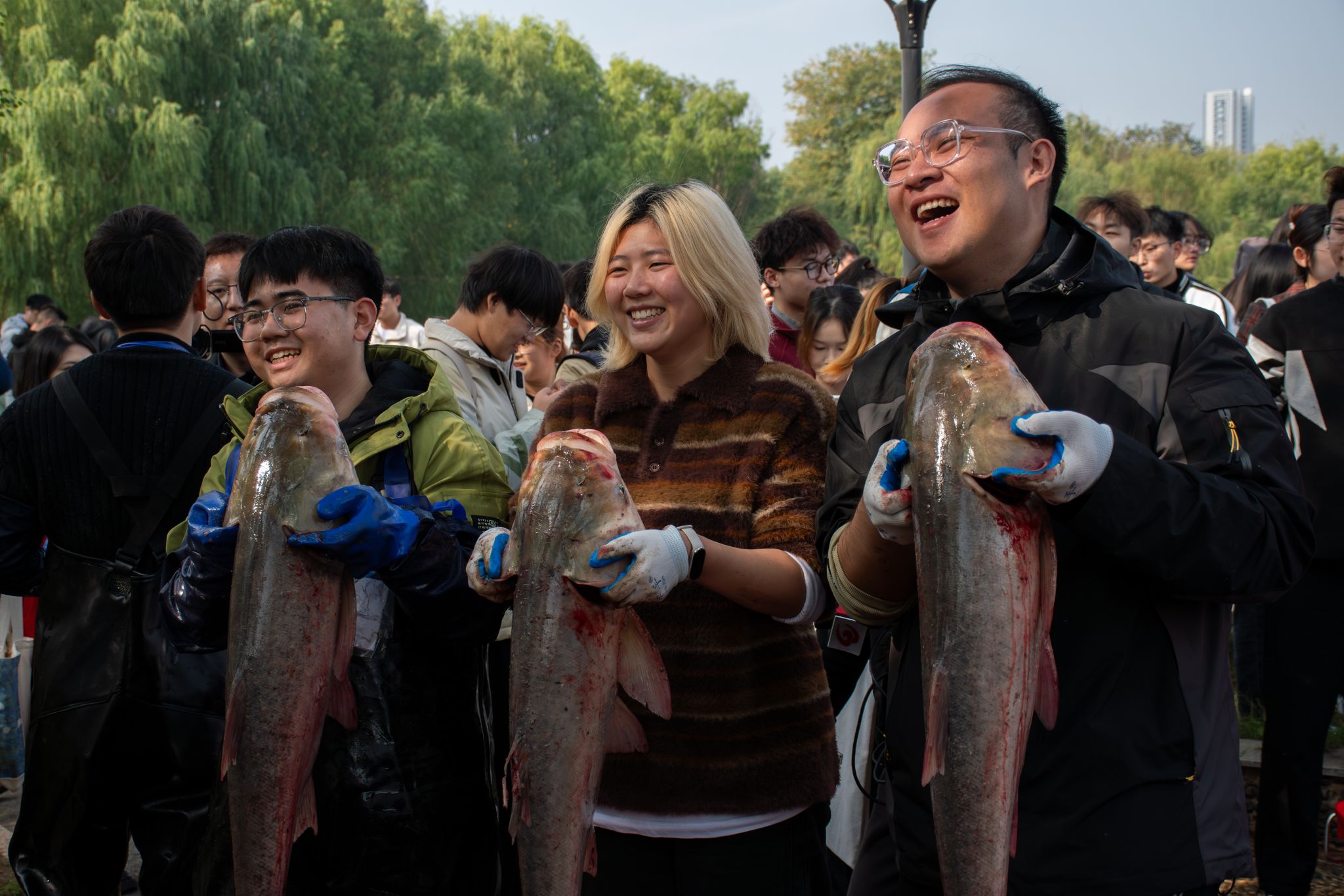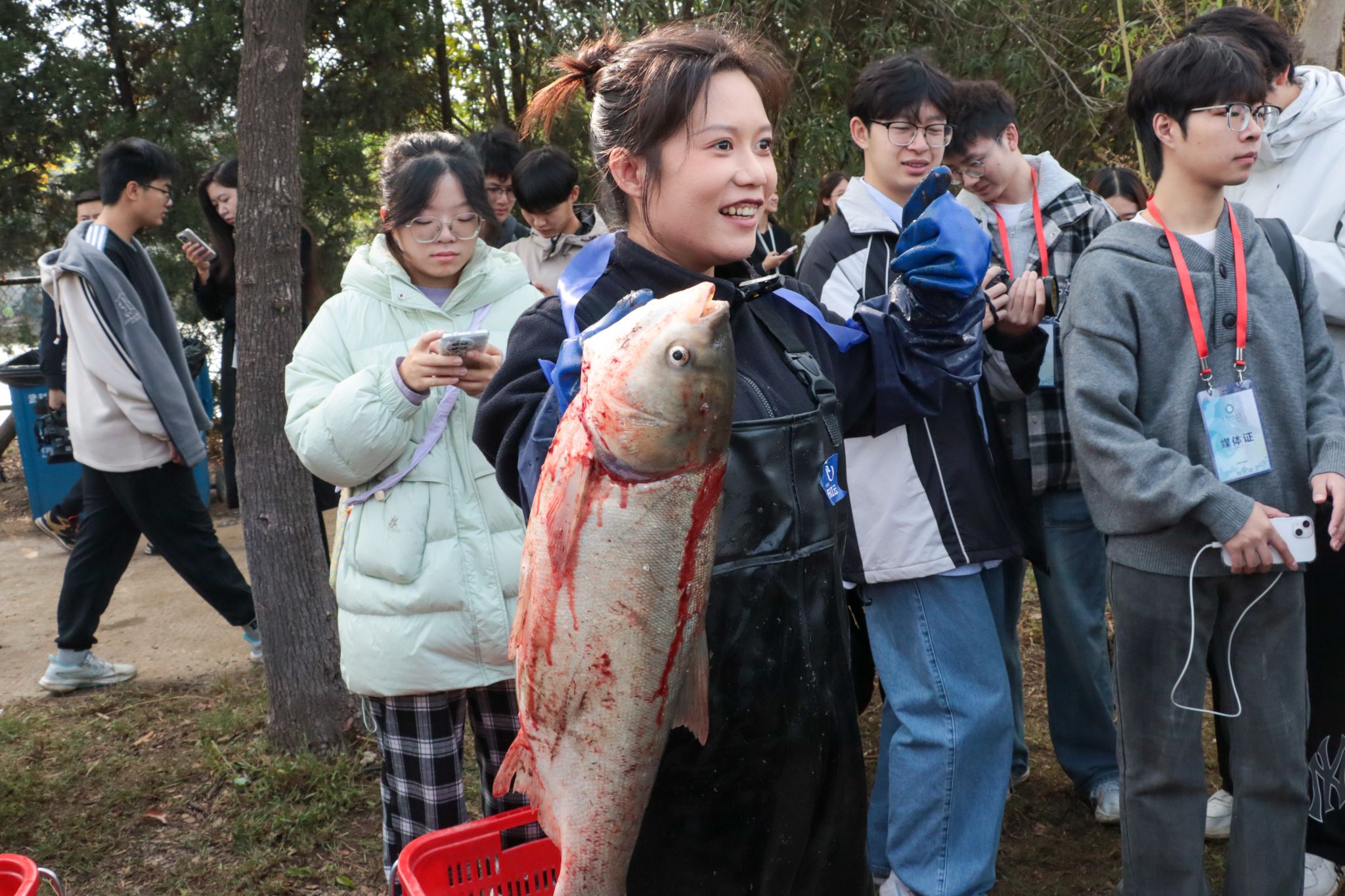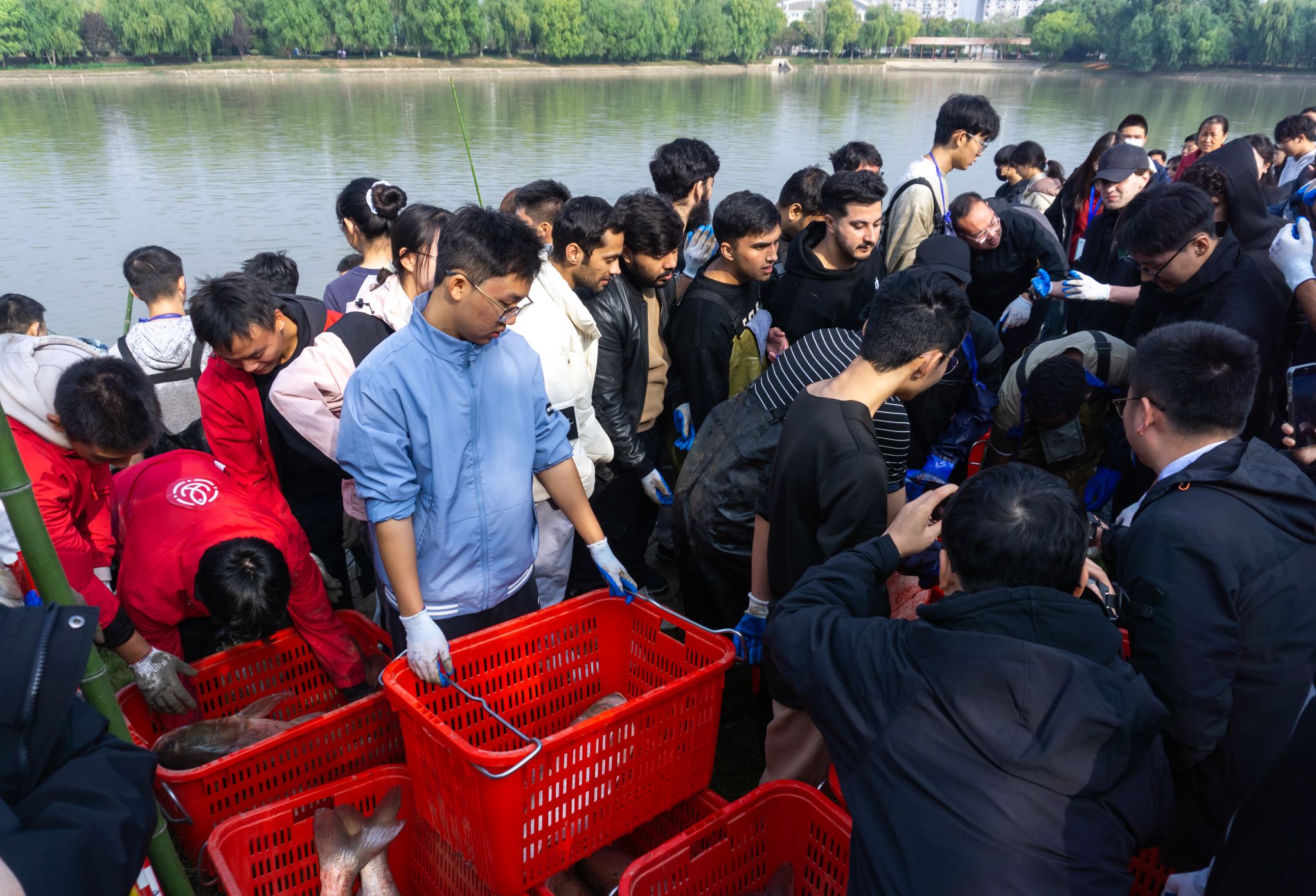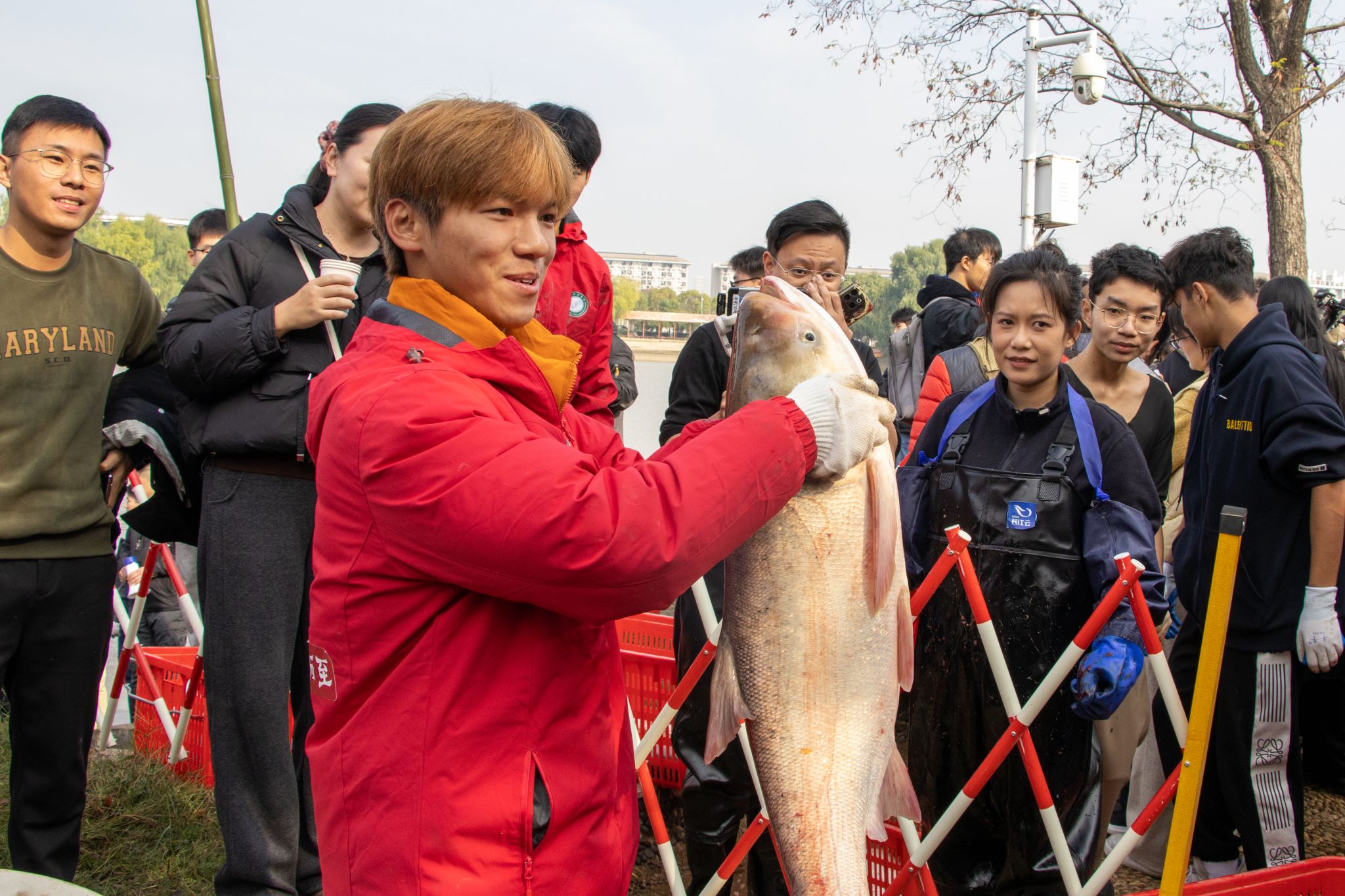 11月21日上午8时,学校近百名中外师生和后勤集团员工身着统一的红色服装,在沁湖边拉开了捕鱼活动的序幕。经过半个多小时的激烈争夺,信息学院徐润收获了一条20.5斤重的大鱼,获得了今年的“捕鱼王”称号。