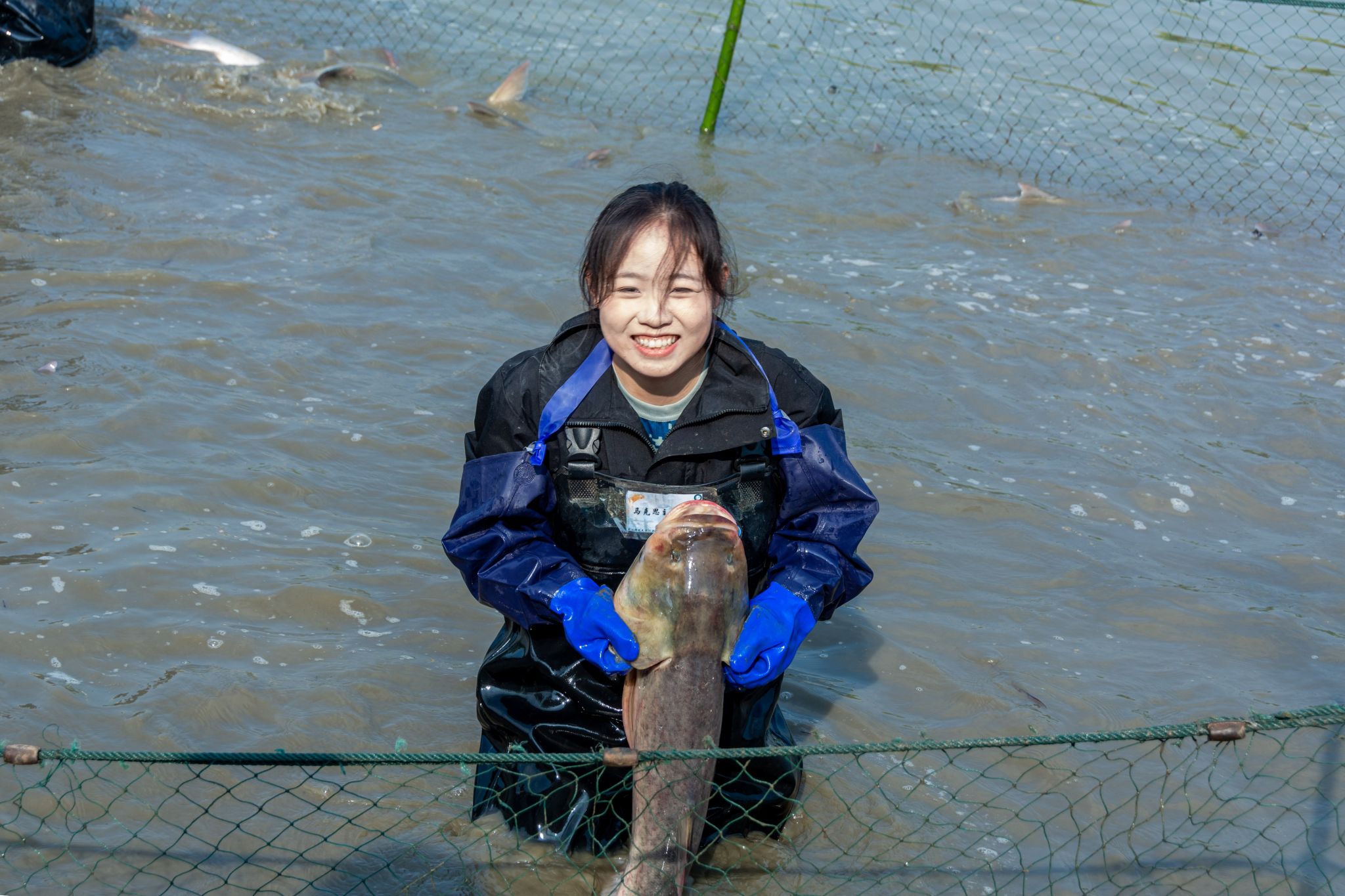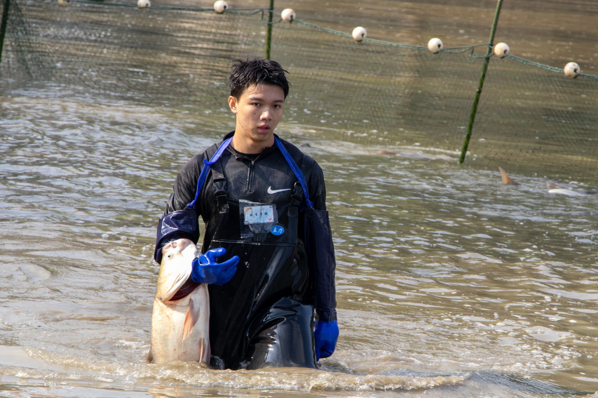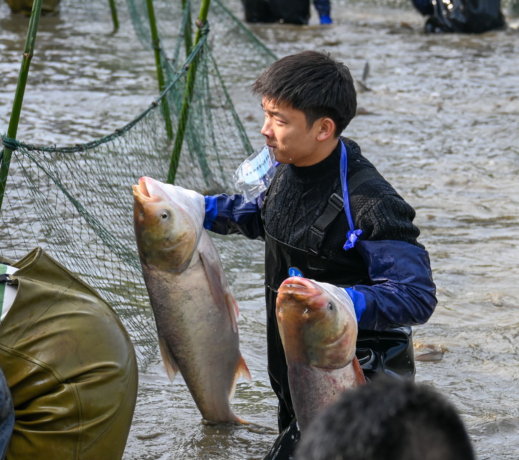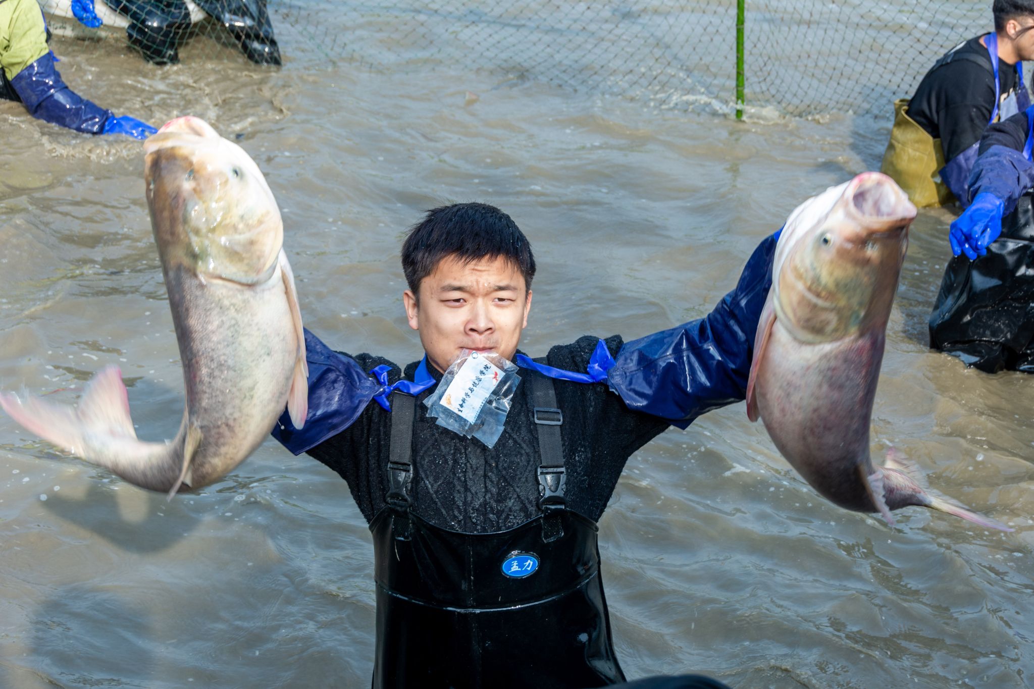 后勤工作人员展示鱼 姜永鸿摄