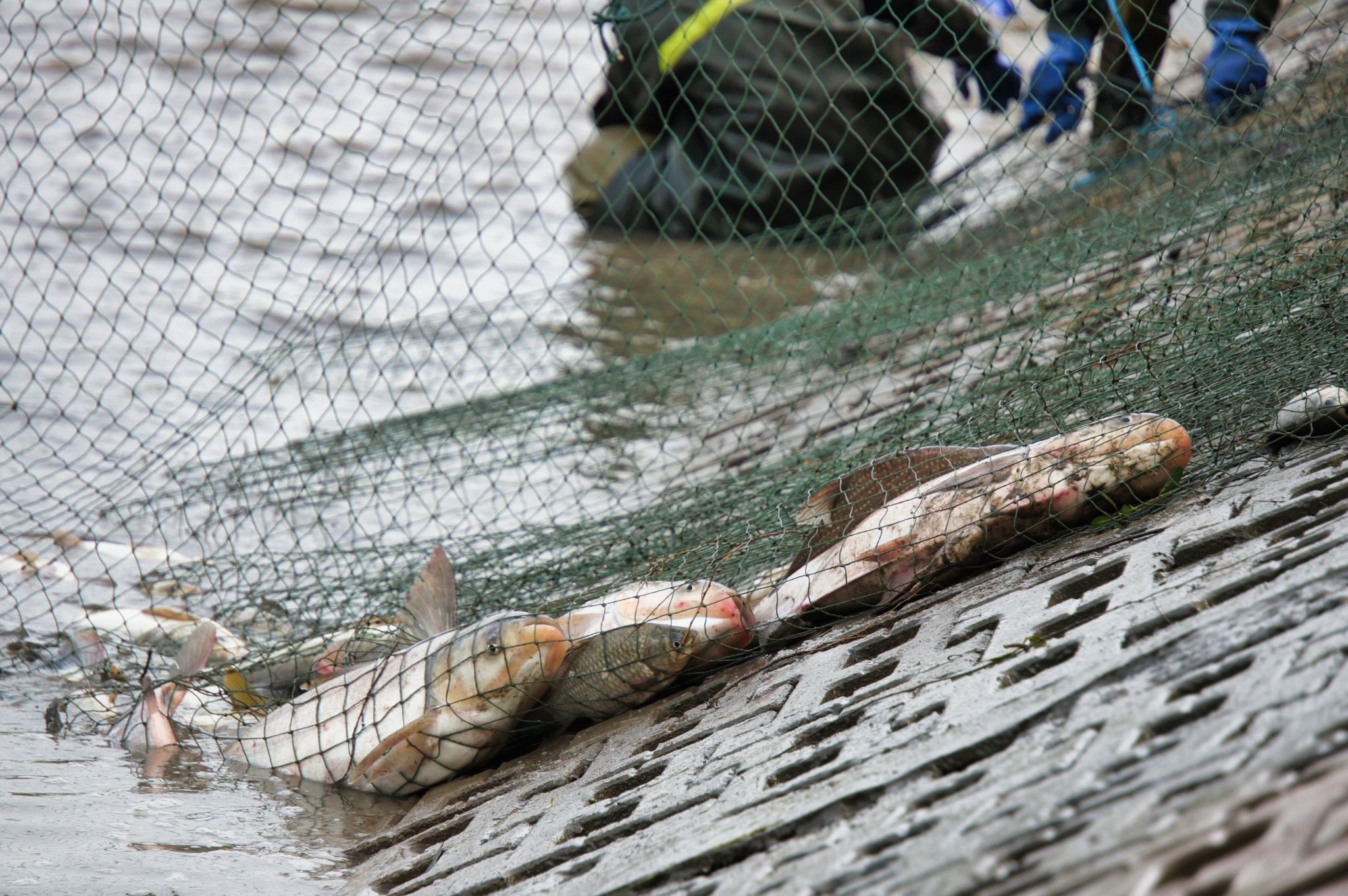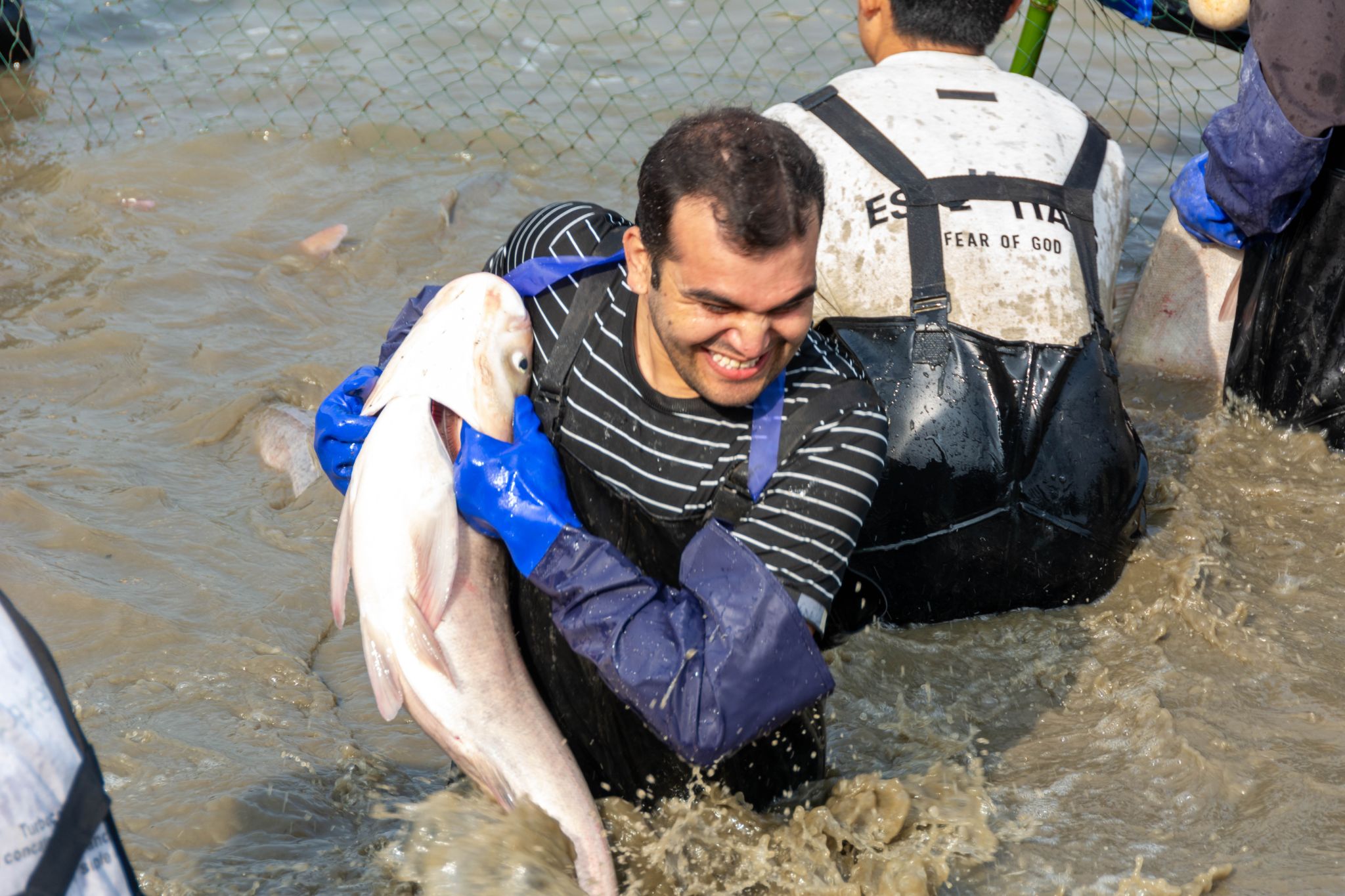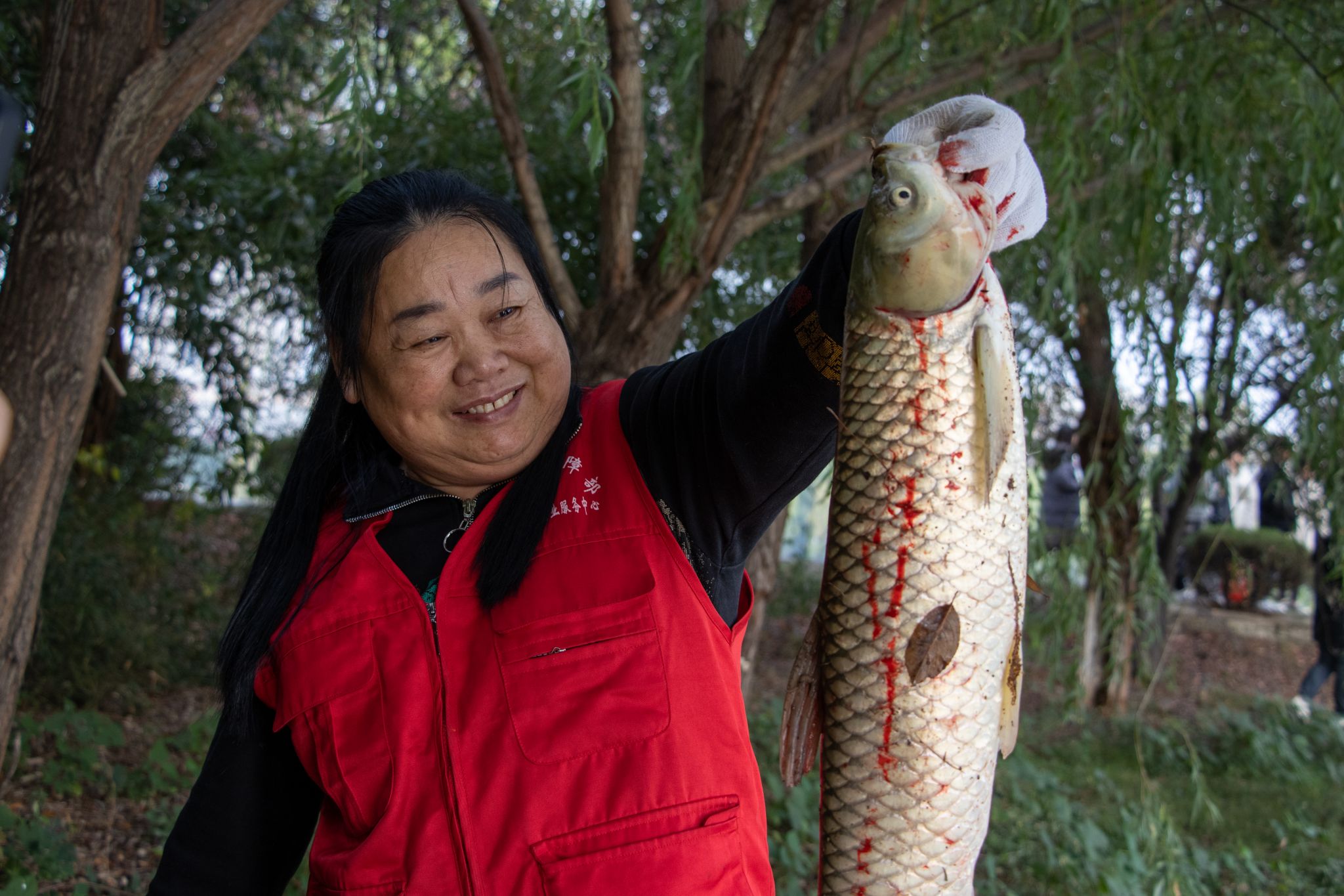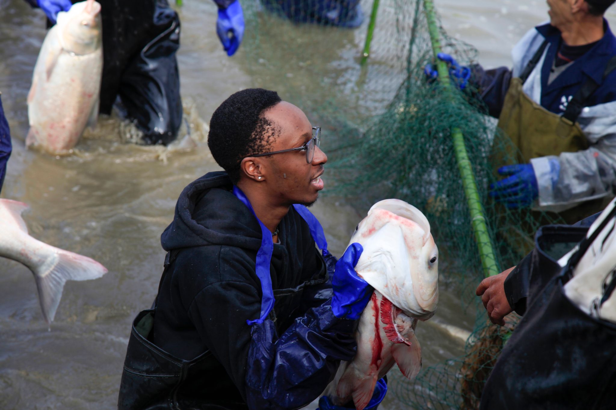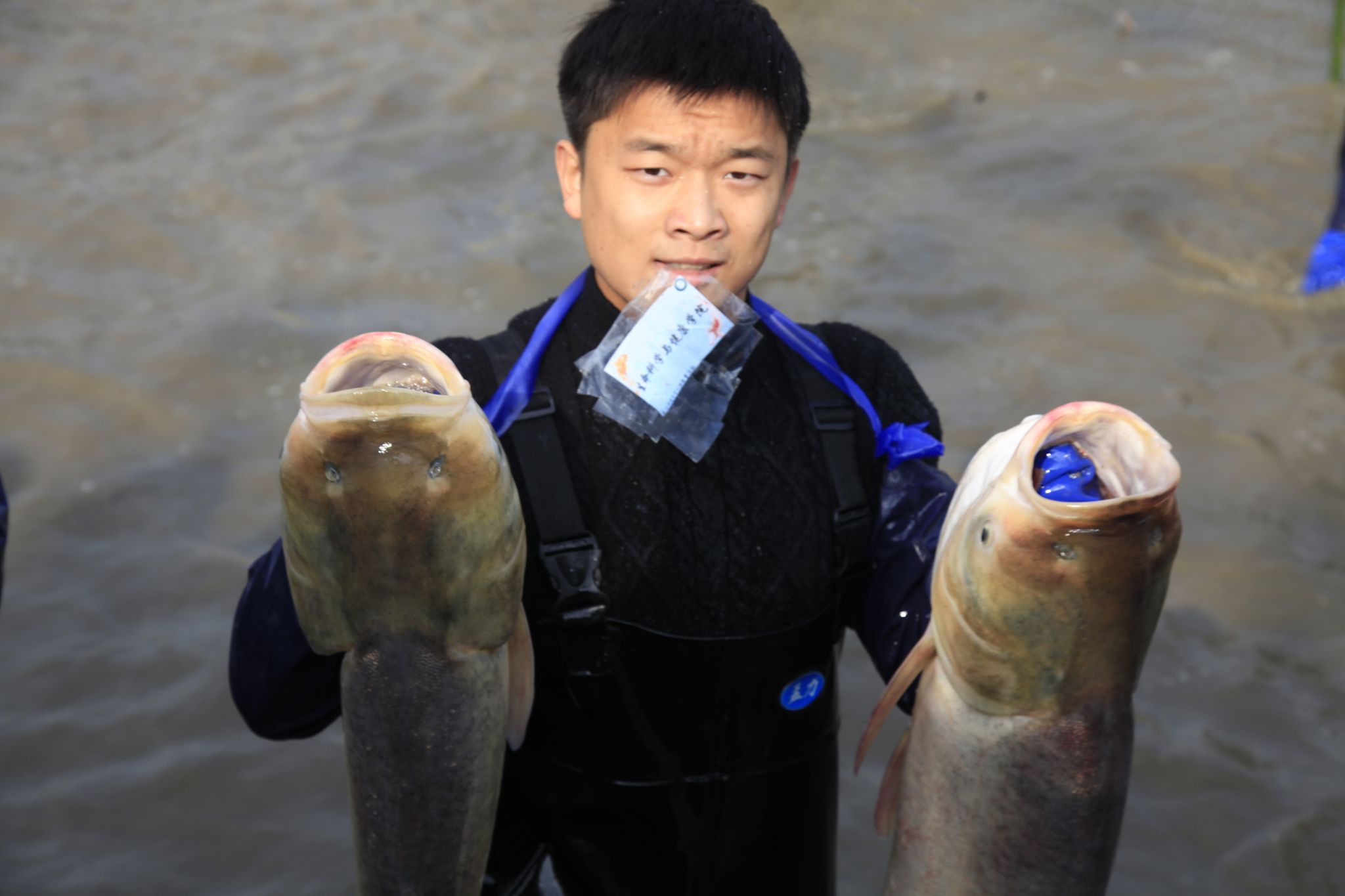 后勤工作人员展示鱼 姜永鸿摄