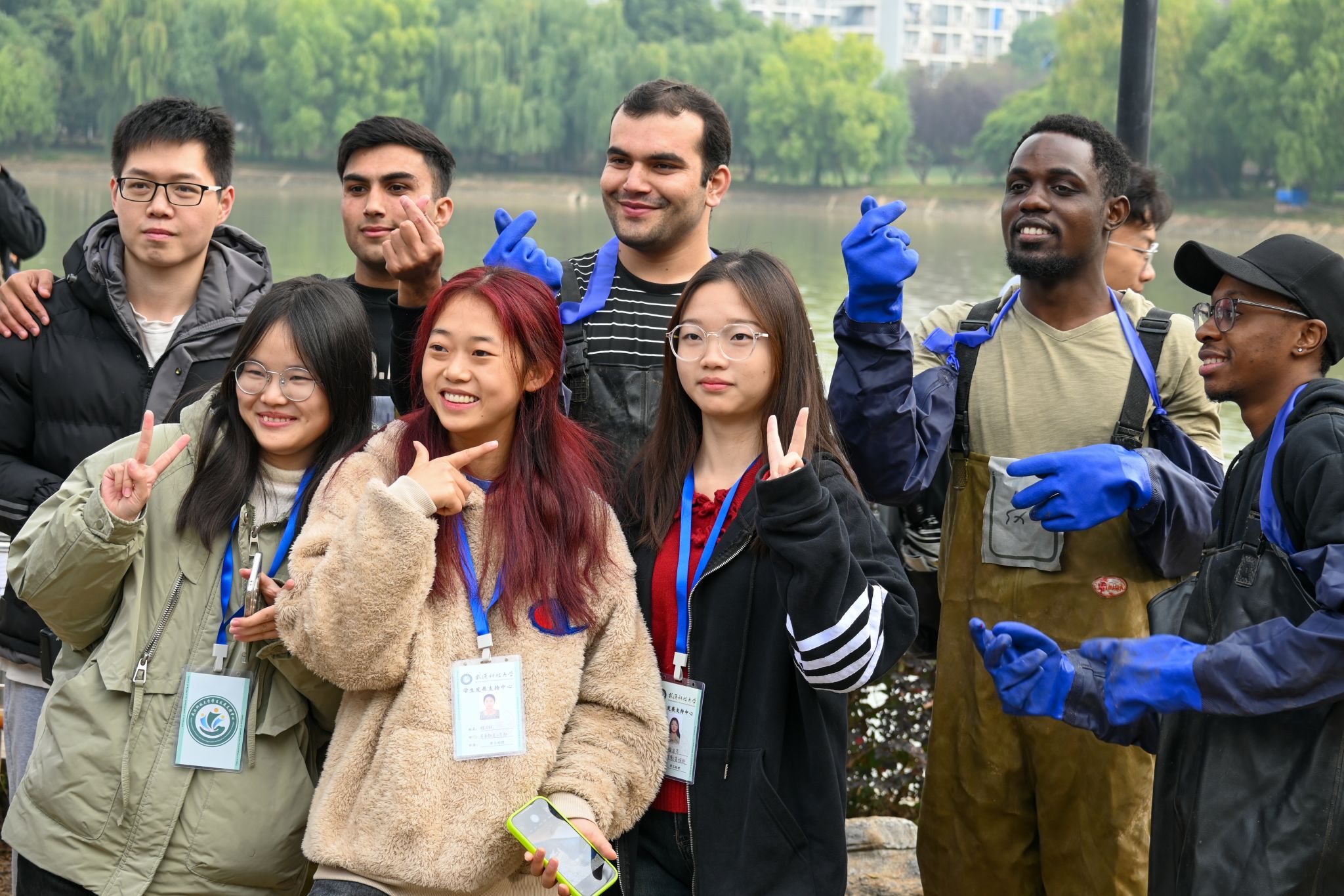 观众和留学生捕鱼选手合影 黄宏杰摄