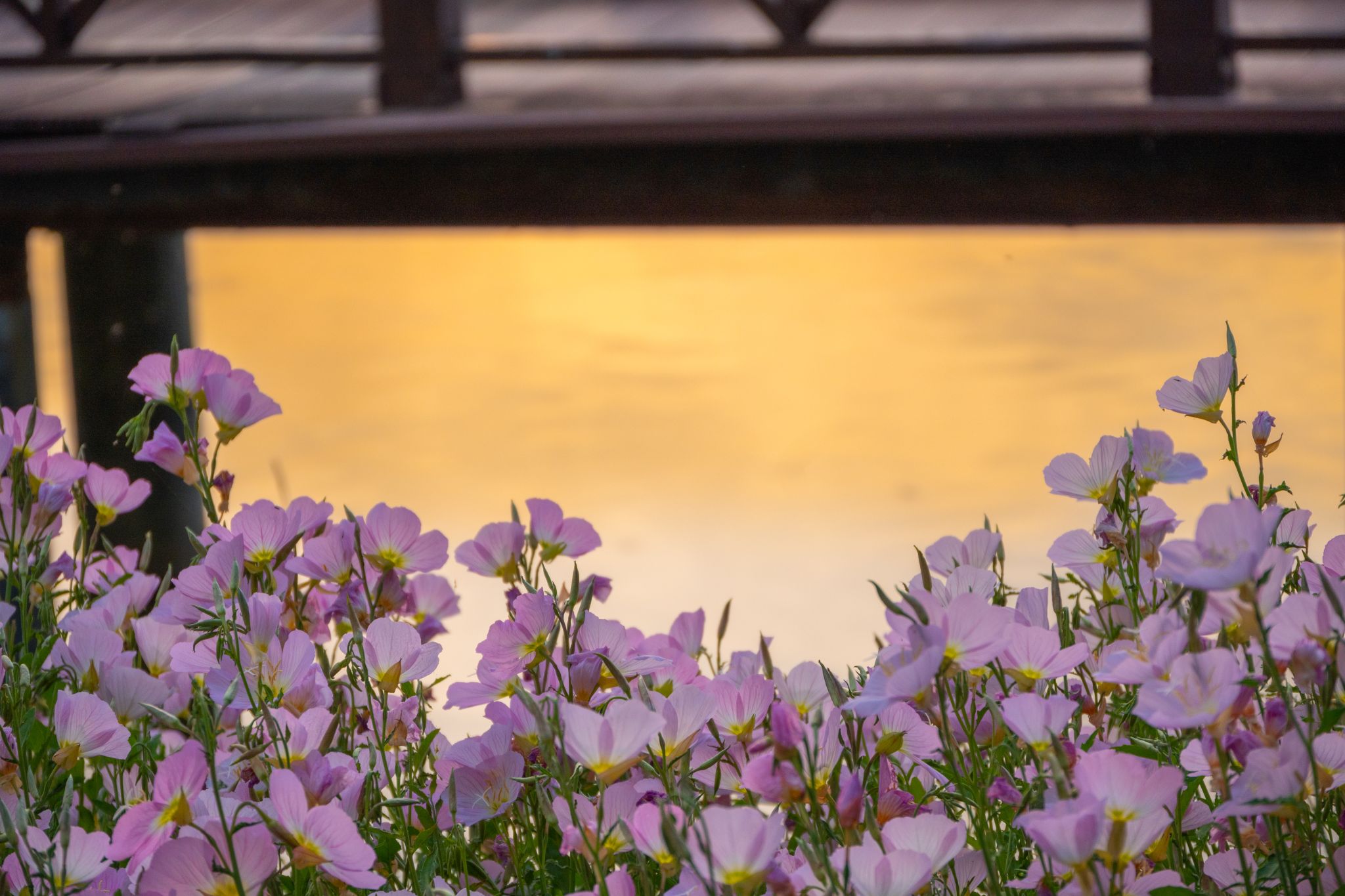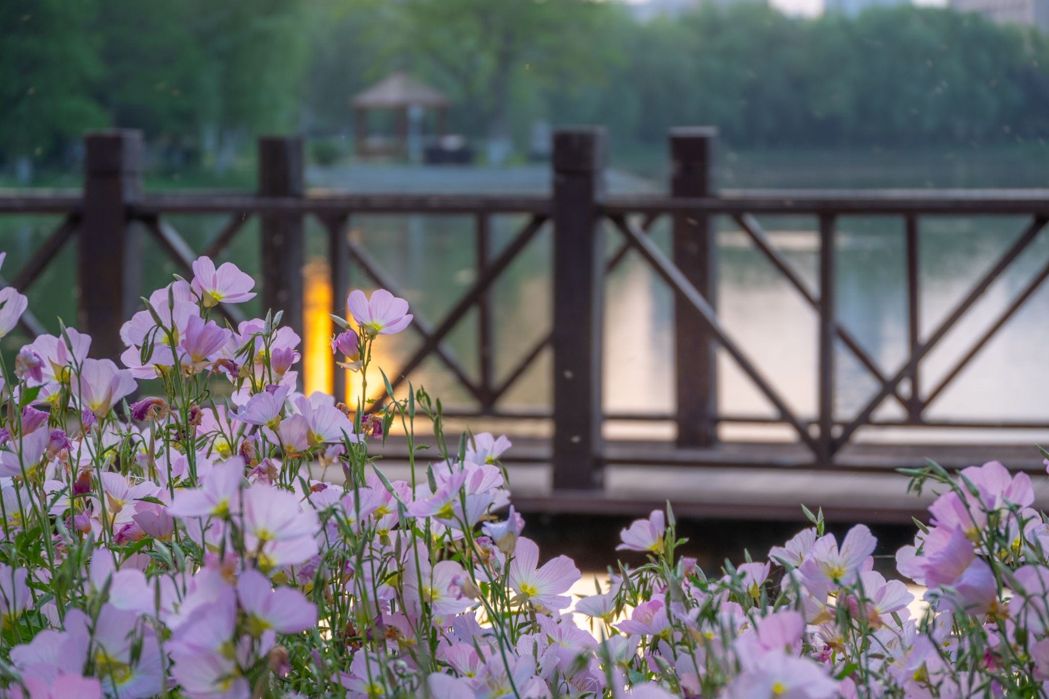 沁湖边的美丽月见草与沁湖桥 陈楷林摄
