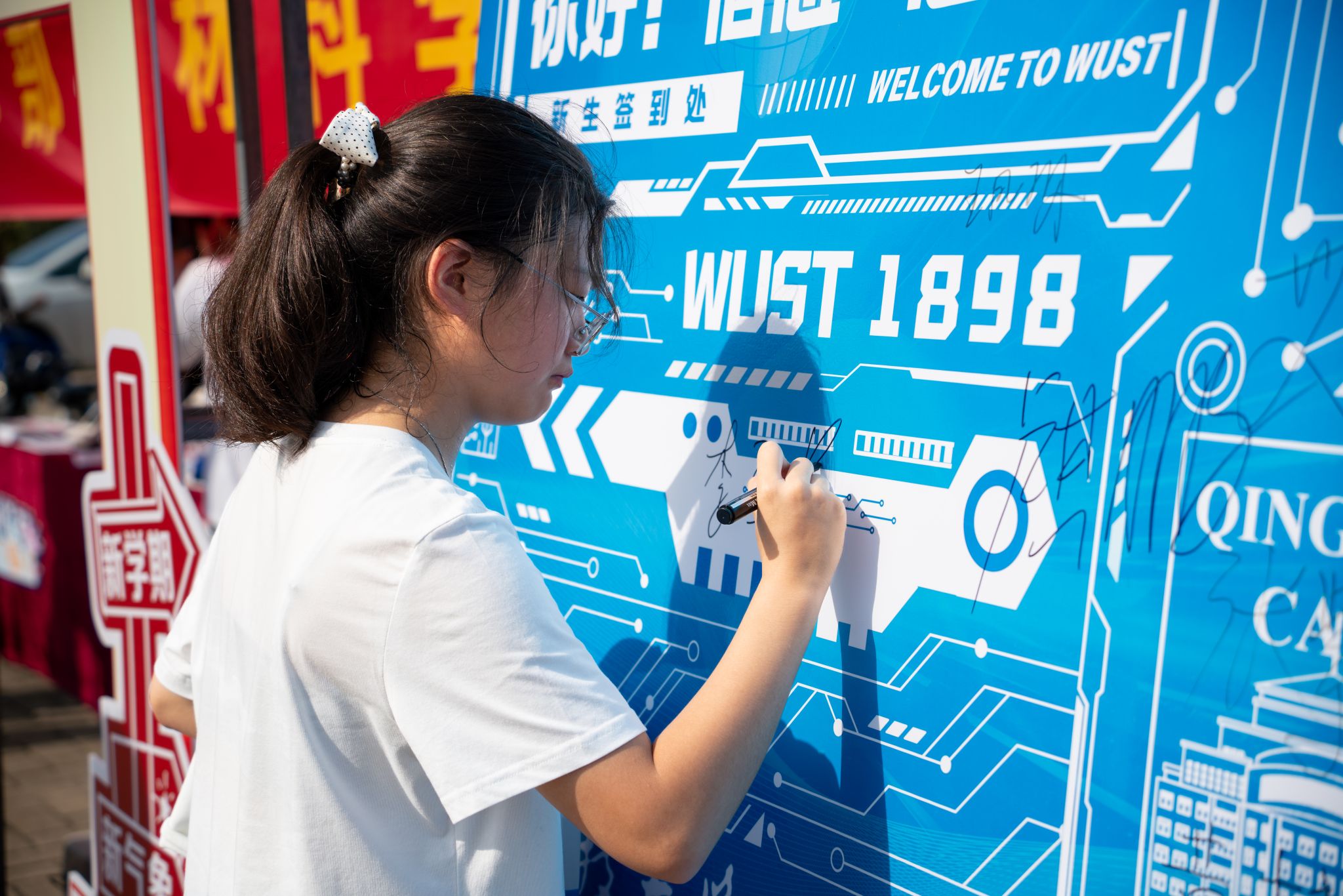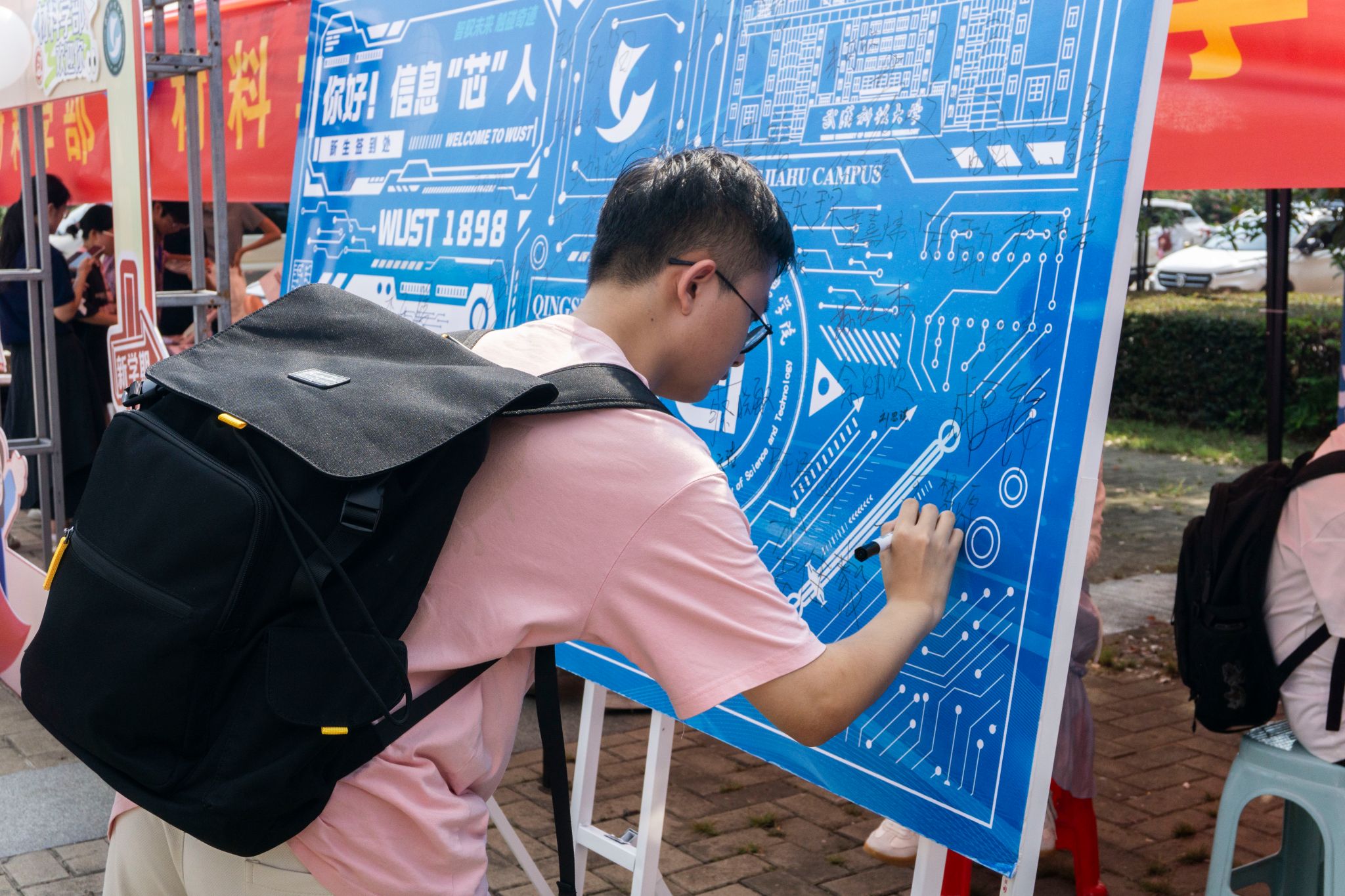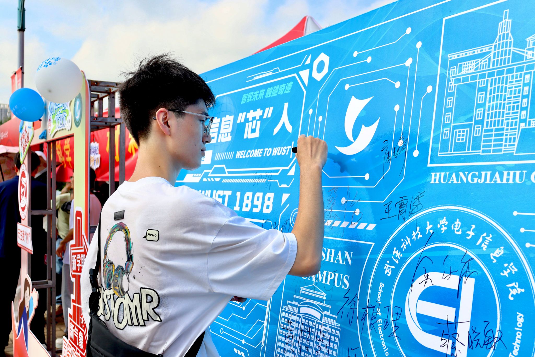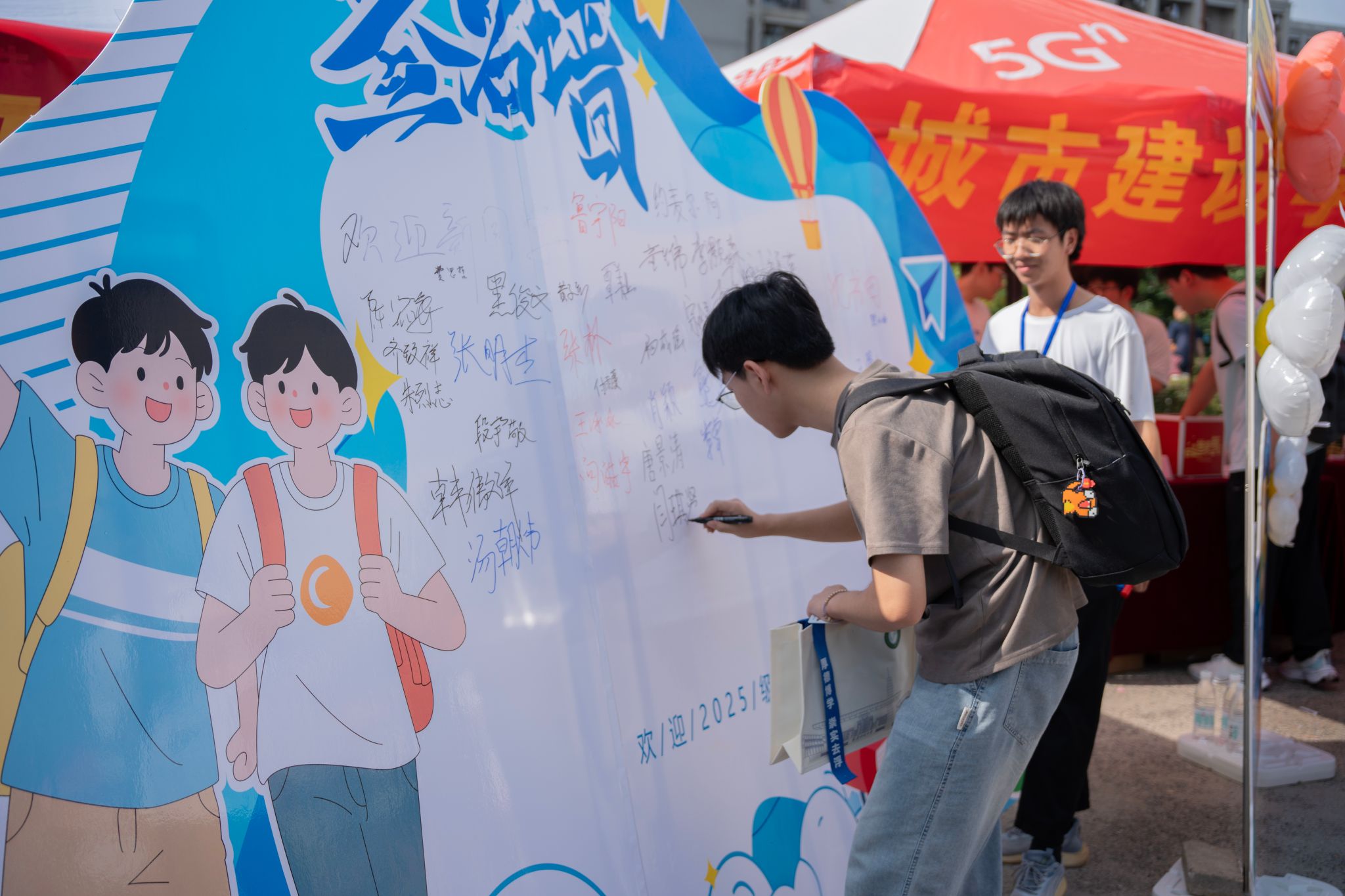 电子信息学院新生在签名墙留下自己名字 高文帅摄