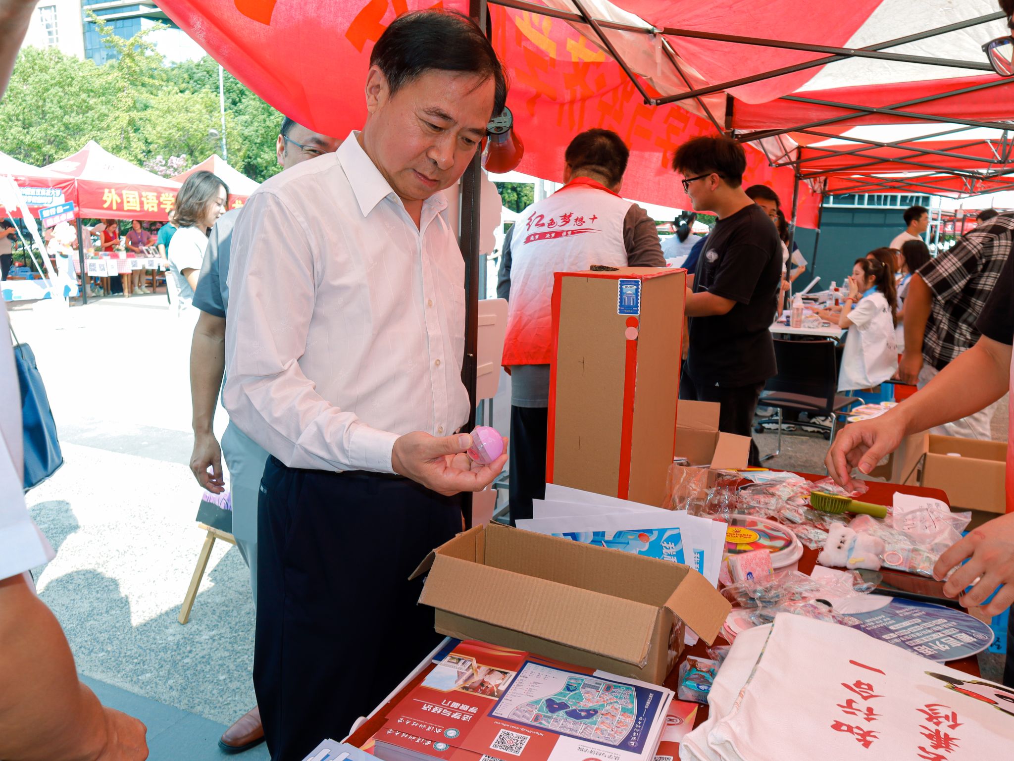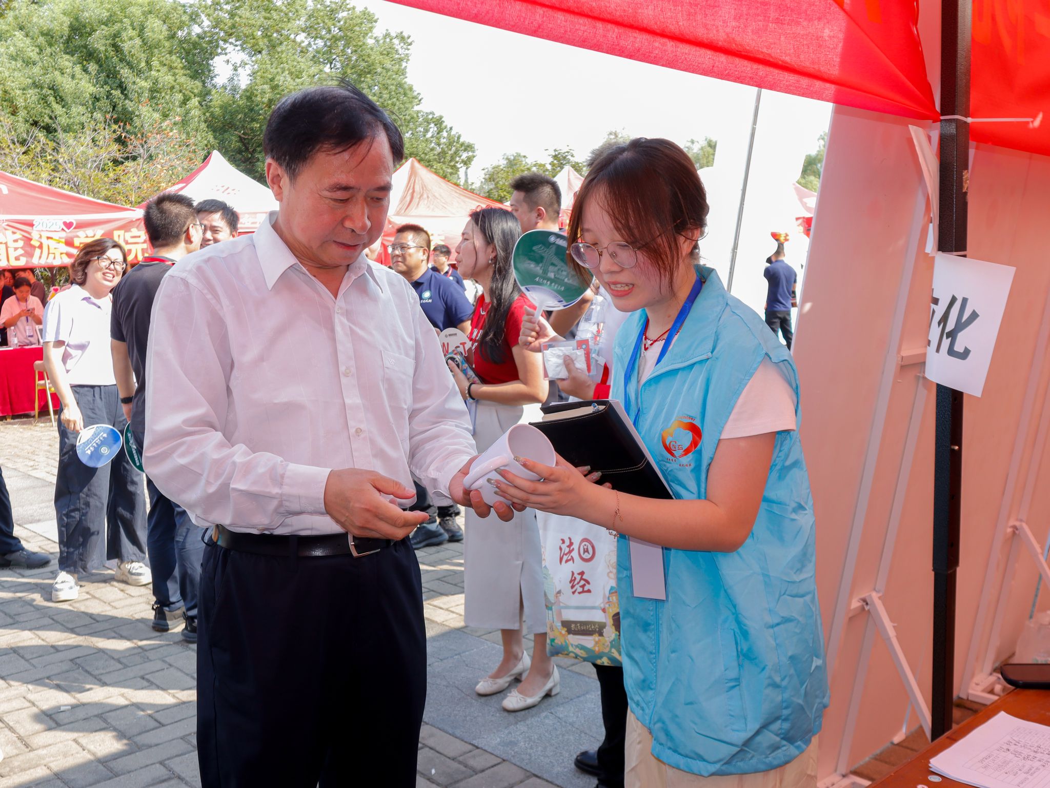 化工学院志愿者为校党委副书记孙国胜介绍文创杯子 王铭浩摄