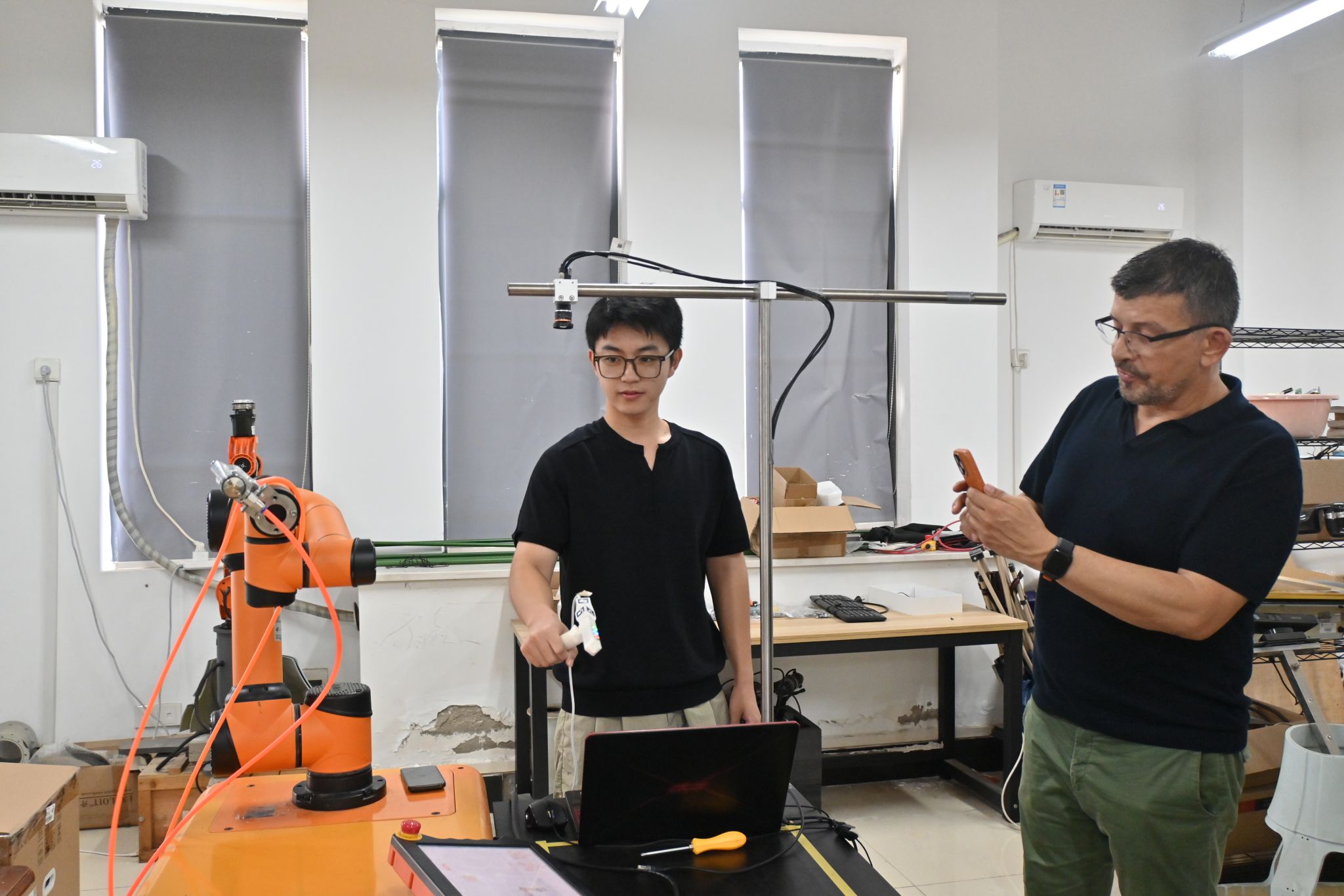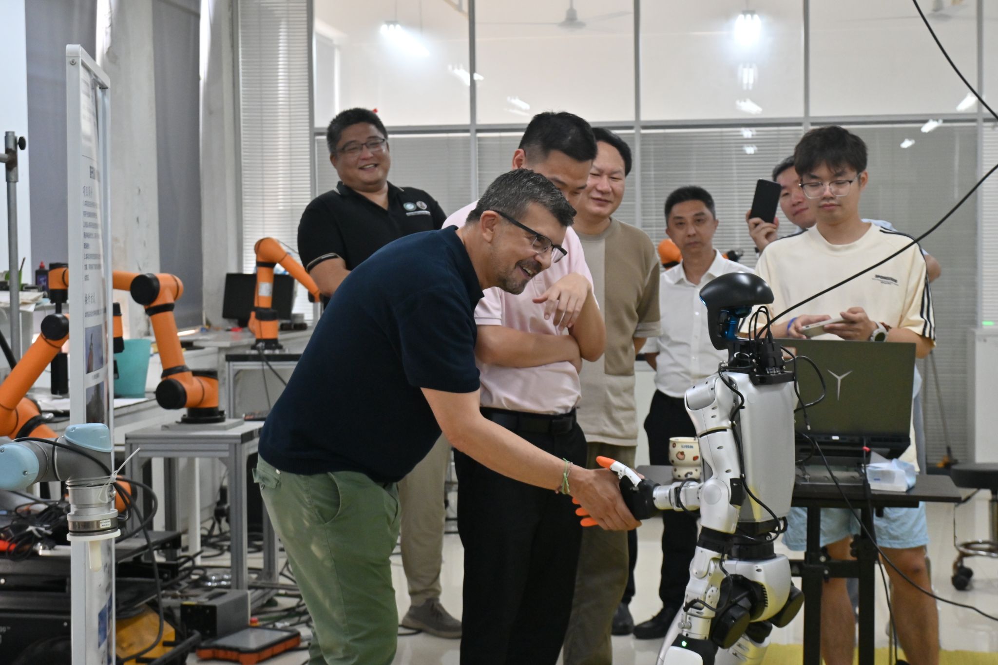 与机器人握手 唐思彤摄