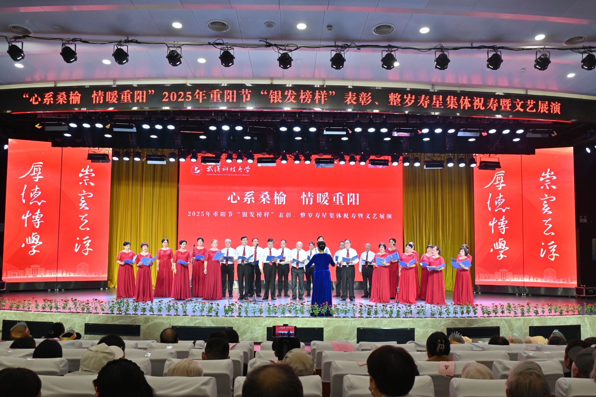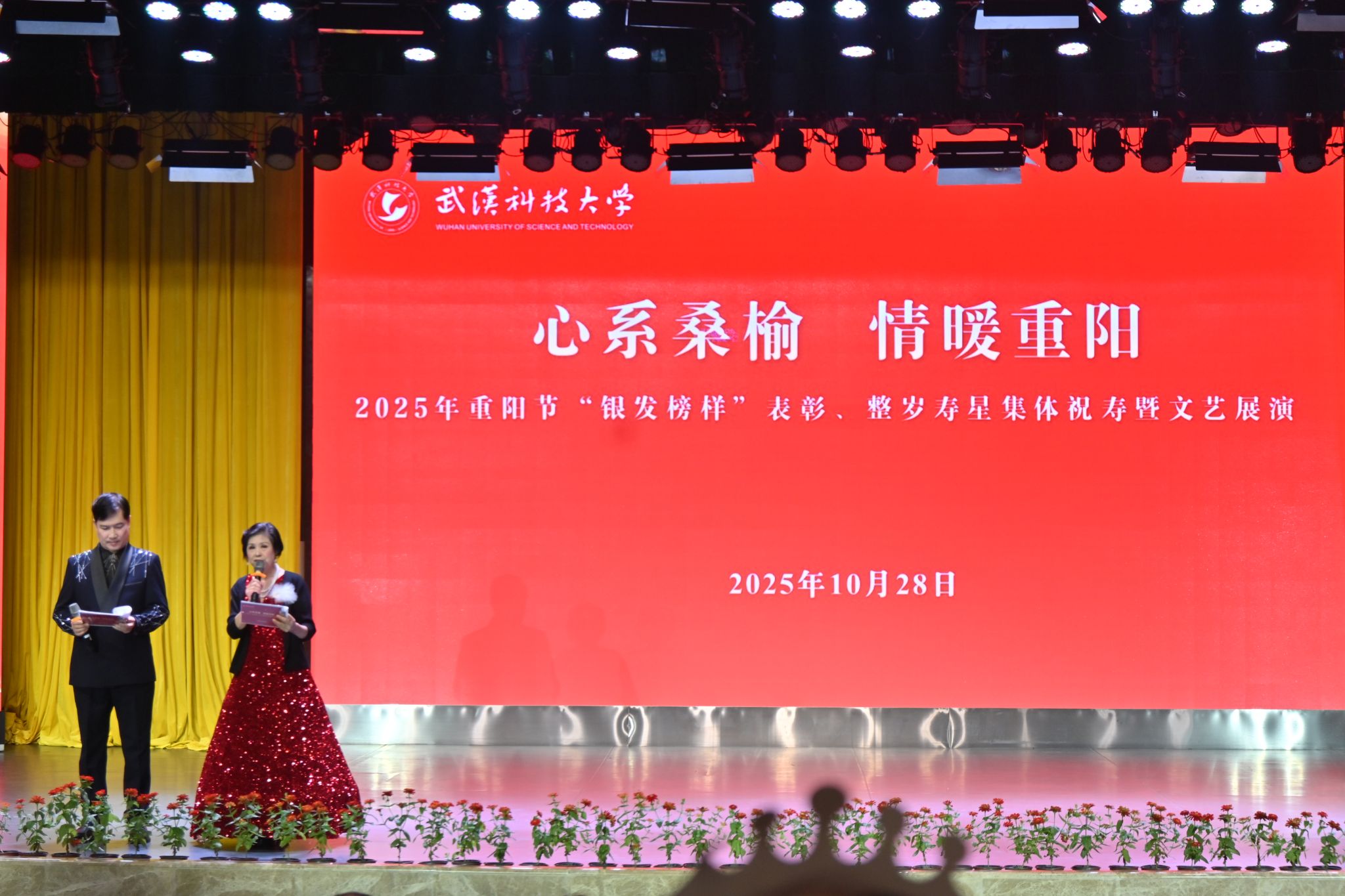 10月28日上午,学校在青山校区碧园会堂举行“银发榜样”表彰仪式暨重阳节集体祝寿活动,现场表彰首届“银发榜样”离退休教职工先进集体、个人,校领导为整岁寿星祝寿。文艺展演环节,京剧表演、湖北小板、时装秀等表演丰富多样、精彩纷呈。
