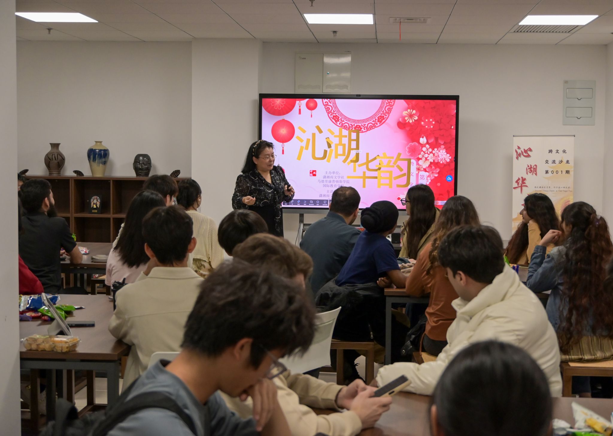 2025年10月16日晚,国际学院联合马德里康普顿斯学院、潇湘雨文学社共同于国际学院举办“沁湖华韵”跨文化交流沙龙。