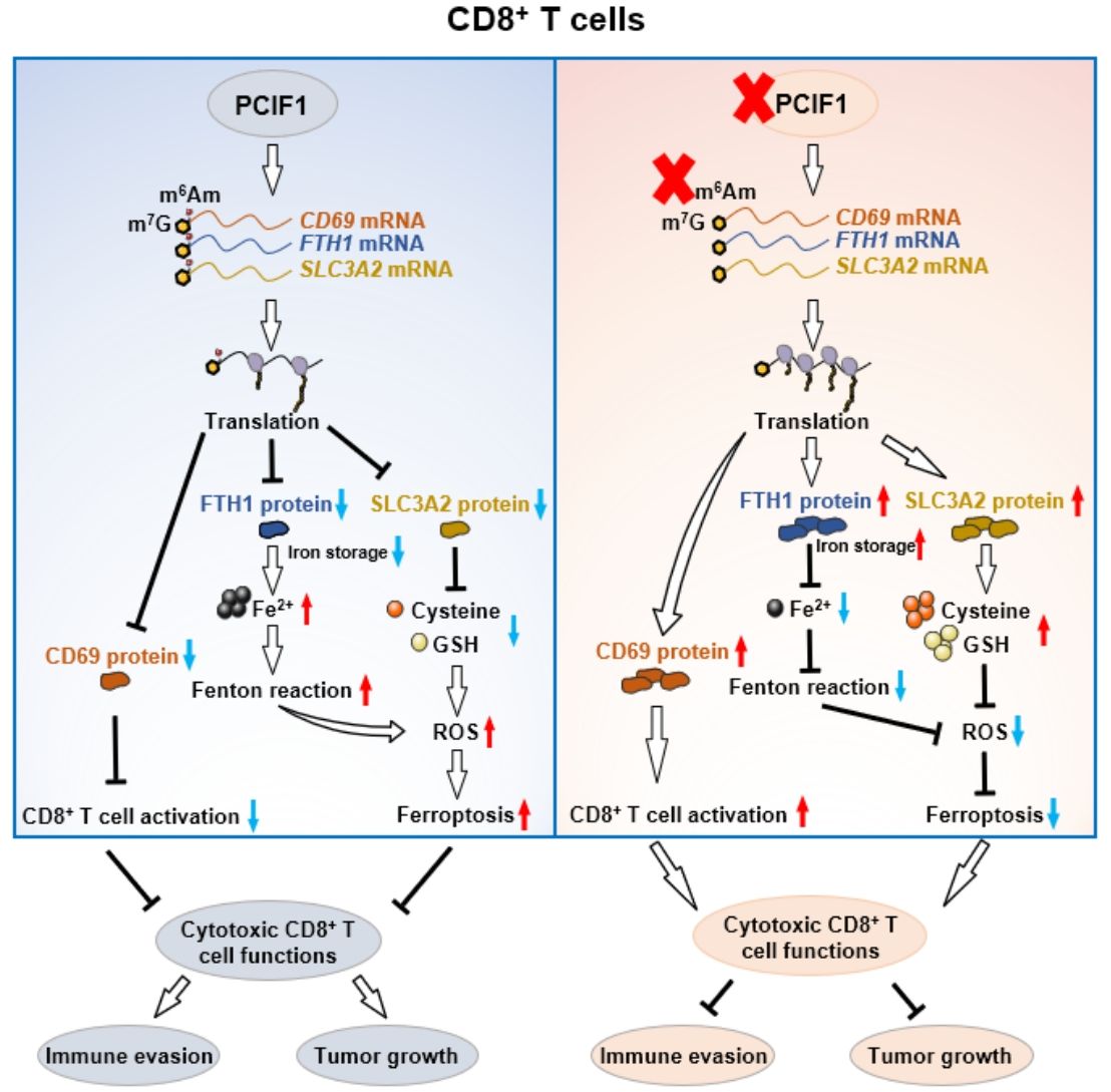 N6, 2’-O-二甲基腺苷 (m6Am)是哺乳动物中最丰富的甲基化修饰之一,位于mRNA的5’末端帽子结构。PCIF1是迄今为止唯一被鉴定出的能够催化mRNA m6Am修饰的甲基转移酶,能够特异性识别mRNA的5’帽子结构并催化m6Am修饰,是m6Am写入机制的核心分子。然而,尽管PCIF1作为唯一的m6Am写入蛋白,其生理和病理功能研究仍处于起步阶段。在此之前,PCIF1在T细胞功能调控及T细胞介导的抗肿瘤免疫中的作用尚属未知领域。