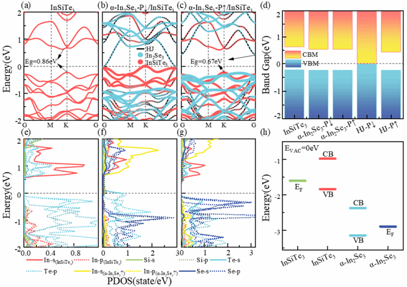 研究团队以二维铁电材料α-In2Se3和二维半导体材料InSiTe3为研究对象,构建了构建二维范德华异质结。通过改变α-In2Se3的极化状态,发现异质结的Eg可以通过铁电极化的反转来调节,铁电极化从0 eV(InSiTe3/α-In2Se3−P↓) 至0.75 eV(InSiTe3/α-In2Se3−P↑),实现了从0到1的逻辑状态控制,说明了铁电极化的变化影响了电荷的移动,从而实现对光学性能的调制效果。