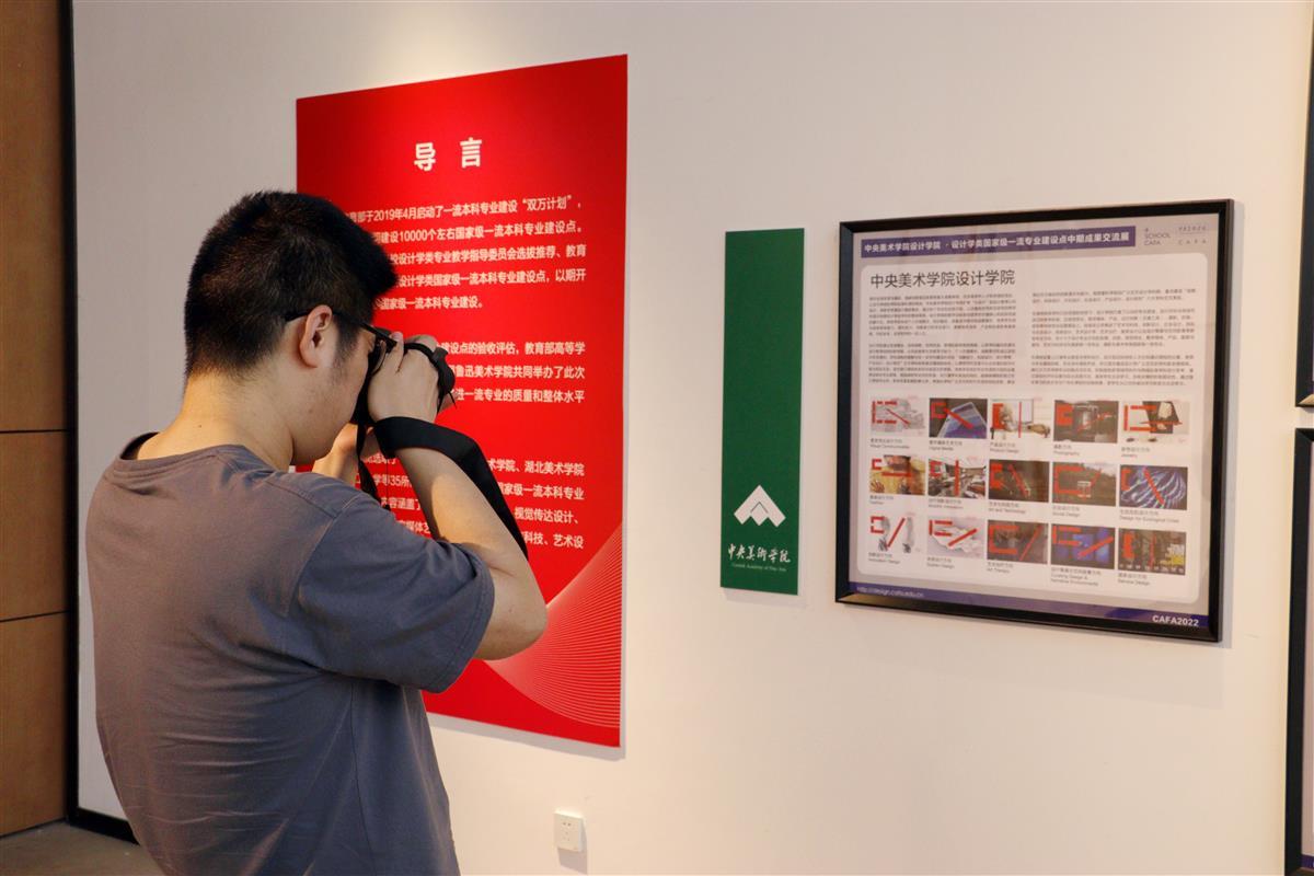 展厅里,还设置了一排排书架,陈列了数十种设计学类学术专著、教材和作品集,供参观者翻阅。每天前来观展的人络绎不绝,许多高校组织教师团体前来观展,学习一流专业建设经验,并在现场召开研讨会。