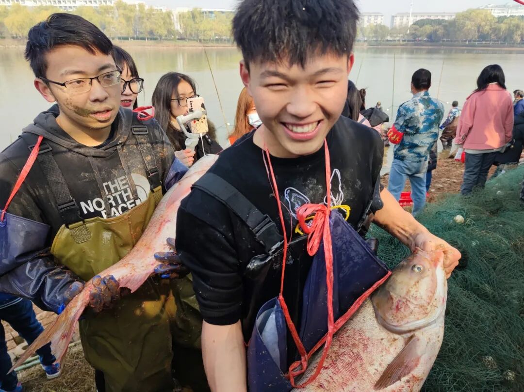 今年沁湖鱼的产量大约有2万余斤,20日早上,师生们一同捕捞了约8千斤鱼。为了更好地参与捕鱼,提前半个多月,志愿者们就进行了抛洒渔网的训练。20日的捕鱼活动中,艺术与设计学院志愿者张哲晗以一条7.8公斤重的大鱼获得了“沁湖鱼宴·捞鱼王”称号,来自机械自动化学院志愿者彭鸿博则凭借一网70余斤的鱼摘得“捕鱼王”的桂冠。