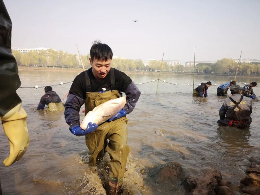 “今年元月左右,我们后勤集团投放了1万多斤鱼苗,10月下旬开始安排学生投放草料,并有专人24小时值班。12月初开始有计划地放水赶鱼,冬至前收网。”学校后勤集团副总经理杨宏介绍:“我们在投放鱼苗、养鱼、捞鱼等阶段都会实时检测水质,医学相关专业的老师还会把水样拿到专业检测水质的实验室、食品药品监督局化验,符合标准后我们才会进行捕捞。”