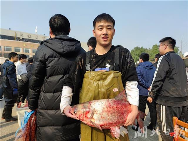 这是武科大一年一度的“沁湖鱼宴”活动的现场,今年是鱼宴举办的第六年。每年元月,学校后勤集团在校内人工湖沁湖投放万余斤的白鲢、草鱼、青鱼、花鲢鱼苗,鱼儿们除了是鱼宴的食材外,还可以起到净化水质的作用。