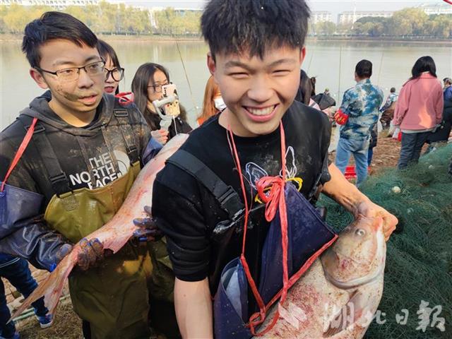 咚咚咚、咚咚咚……12月20日上午10时,js33333线路登录黄家湖校区沁湖边上鼓点阵阵,在拉网师傅的吆喝声中,渔网渐渐收拢,湖光潋滟中,时有大鱼跃出水面,来自学校各个学院的18位学生志愿者身着捕鱼衣,站在岸边,向湖中抛洒小渔网,一条又一条大鱼被拉拽上岸,引起围观师生阵阵惊呼。