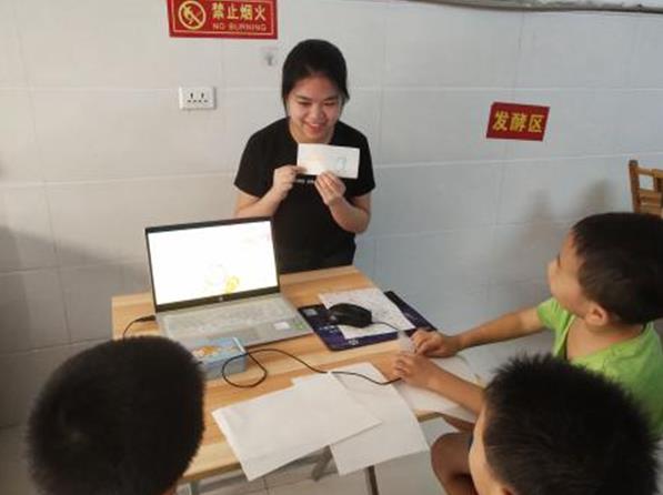除了线上授课以外,武科大外院暑期社会实践团成员张芹诗受此次活动启发,在保证安全的前提下将教学目光投放到线下,组织开展了一拖三线下支教活动,致力于为周边孩子们的学习贡献自己的力量。