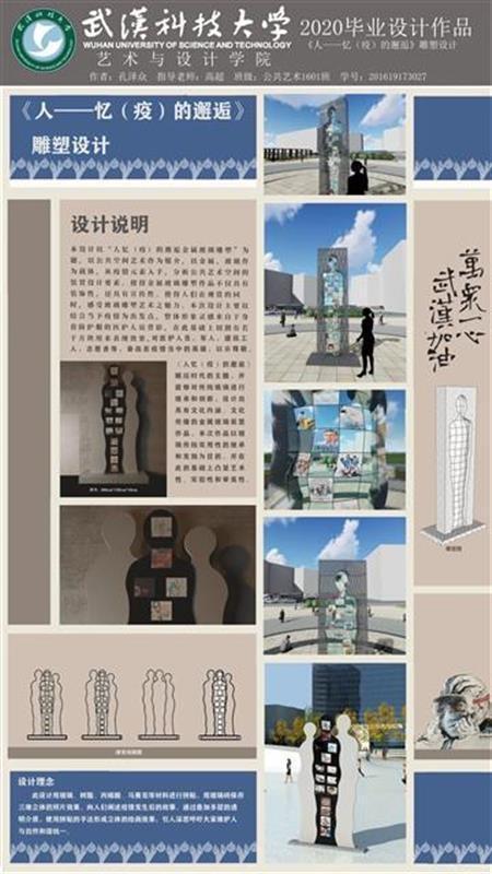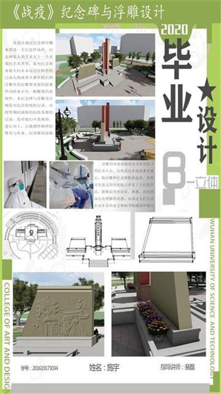 公共艺术设计专业2020届毕业生施宇,作品名称是《战疫》纪念碑与浮雕设计。该作品的设计通过纪念碑浮雕营造一个纪念性场所。纪念碑是人类艺术史上一个重要的艺术类型。浮雕具有比雕塑更强的叙事性同时也不失一般雕塑的表现性。本纪念碑与浮雕设计则是对此次疫情的记录,对疫情期间涌现的抗疫英雄的记录,是对他们不畏艰险、逆行而上、自我牺牲精神的赞美与传承,是向英雄的致敬。
