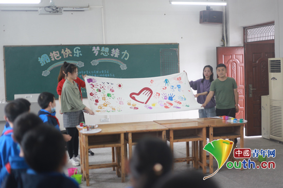 6月8日,“拥抱快乐·梦想接力”关爱留守儿童活动在重庆市武隆区桐梓镇桐梓中心小学举行。图为参加活动的嘉宾与孩子们一起涂鸦绘制梦想。js33333线路登录研支团 供图
