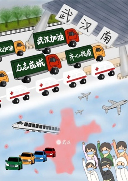 汽车学院的李文婷、肖雪妍,共同创作了“无往不胜”,传达“积力之所举,则无不胜也”的中国抗疫思想。作品呈现了局部、全面两种场景,用云迷雾锁、碧空如洗两种环境,分别展示武汉疫情最危急和疫情得以基本控制的场面。上方是疫情严峻时,来自五湖四海源源不断的物资及医护支援车辆;下方是疫情得以控制时,前来支援的战士们乘车归家团圆,及武汉人民外出复工复业的画面。 (程毓)