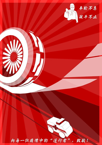 艺术学院1701班的肖聪迪和郭家花,喜欢手绘和汽车,共同设计了作品“车轮不息,战斗不止”,向逆行者致敬。作品为红色基调,体现与疫情斗争的决心与毅力;车轮从画面斜上方滚滚而来,代表那些勇往直前的逆行者,不畏危险和困难;以车轮为中心,向四面八方辐射出光芒,寓意着得益于便利的交通,让各地的救援物资及时到达武汉;画面下方一辆救护车,代表着全国各地的医务工作者,正是他们的努力,使武汉重新步入正轨,预示武汉重新振作腾飞。