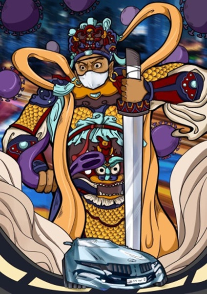 艺术学院视传班的向维露,创作了作品“武神”,运用中国元素表达中国人民齐心抗疫的决心和战胜病毒的信心。作品以ps板绘的形式,为手持利剑的武神戴上了口罩和护目镜,象征一线工作者在大家心中的威武高大,为人民的健康保驾护航;画面中添加汽车、马路及霓虹灯等汽车元素,将传统文化与现代汽车文化相结合,预祝抗疫的胜利,歌颂与赞扬在疫情中中国人民众志成城、万众一心的美好品质。