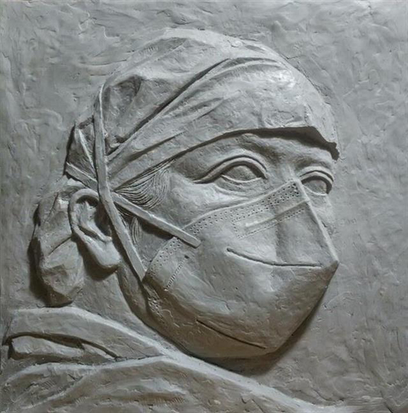 雕塑作品《最美逆行者》,由该校美术老师夏晶阳创作。“一位带着口罩的白衣天使,眼神望向远方,仿佛在期待抗疫胜利。”谈到创作灵感时,夏晶阳说:“医护工作者救死护伤的精神让人感动,他们摘下面罩露出的勒痕又让人震撼,使我产生了强烈的创作欲望。” 由于疫情影响,夏晶阳只能使用家中现存简易工具,历时一周时间精心完成了这幅作品。