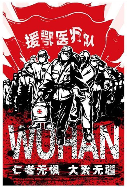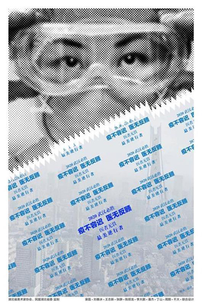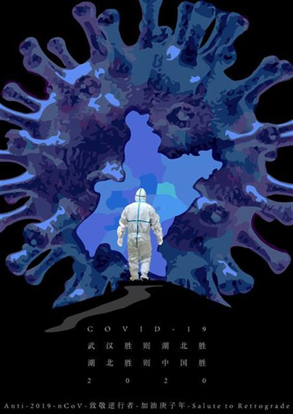 “不同语种的祝福语,构成的白衣天使背影图,背影中心是一个鲜红的十字,周围环绕着“武汉加油”字样。”该校2017级绘画专业大学生葛岚创作了海报《归来》。葛岚说:“用文字构成医护人员的背影,表达希望他们平安回家的祝福。”