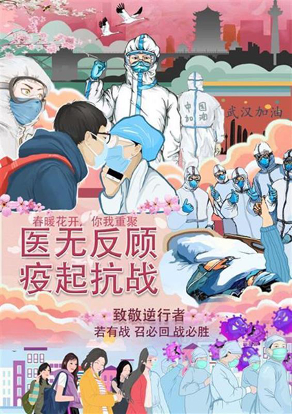 2018级设计专业大学生周文琪的作品是绘画《“疫”起战疫》。作品描述了治愈患者和白衣天使告别,白衣天使战斗归来的场景。整个场景为暖色调,配有“春暖花开,你我重聚”的字样,让人感到温馨。在看了许多疫情新闻后,周文琪深受感动:“无数逆行者在这场没有硝烟的战斗中奋力抗战,守护着我们,期待回到美好安宁的生活。”