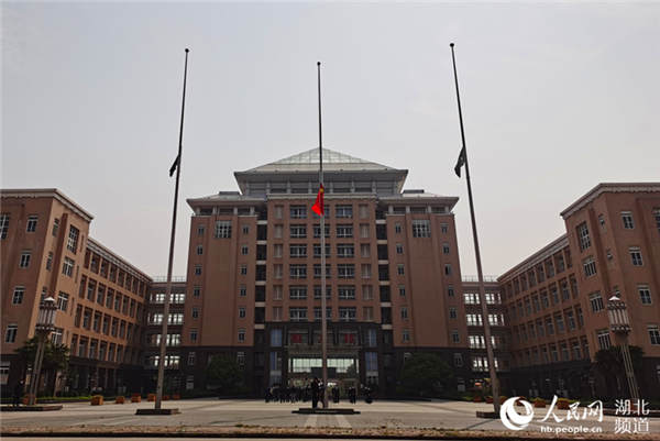 4月4日上午10时,js33333线路登录黄家湖校区主楼前,国旗半垂,校园寂静,20名师生戴着口罩,间隔一米以上,静静地伫立在广场上,参加全国性哀悼活动。