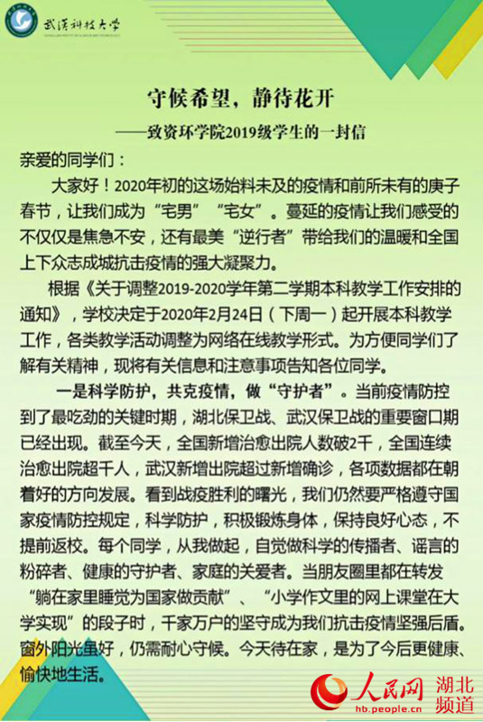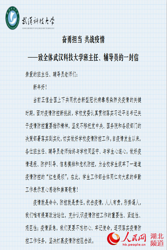 在新冠肺炎疫情防控攻坚时期,教育部思想政治工作司党支部以《共克时艰、勠力同行》为题致信全国高校辅导员。武科大学生工作部第一时间通过网络平台向全校辅导员发布并组织学习,广大辅导员深受鼓舞,积极参与“云讨论”,热议“娘家人”的来信,并转化为实际行动,坚守岗位,共同战疫。