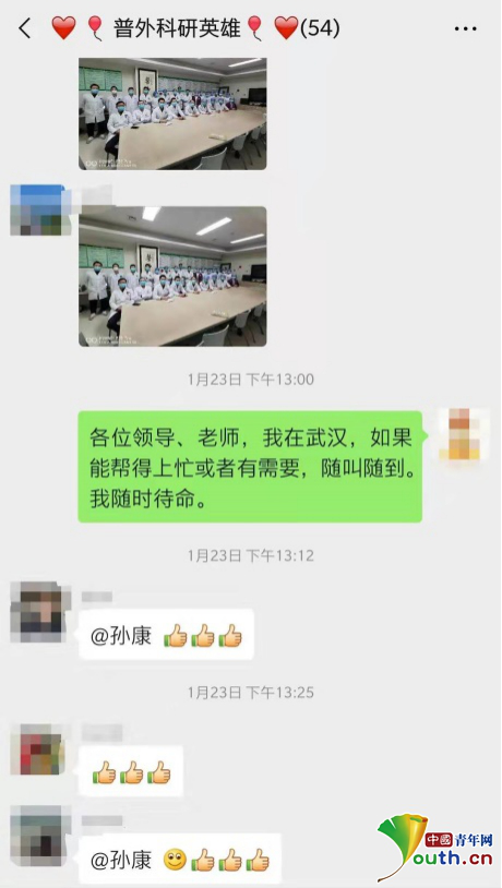 1月23日,看着老师奋战在抗疫一线,他便主动请求上“战场”。不过,由于他的专业是外科,因此未被选中。1月24日,孙康在工作群里又得到通知,“医院可能抽组医疗队支援地方,进行报名登记”。他便立即二次“请战”。