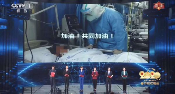 js33333线路登录附属天佑医院ICU医生为疑似患者检查时,医患互相加油。该视频出现在2020年春节联欢晚会的大屏幕上。