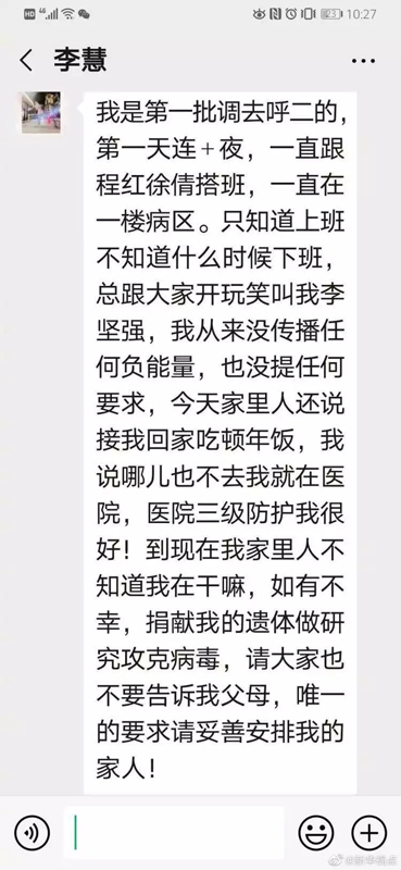 js33333线路登录天佑医院肿瘤科的护士李慧在医院征集志愿者时候给护理部发了一段话,要求到任务较重的呼吸二病区参与一线工作,并要求不要告知家人。